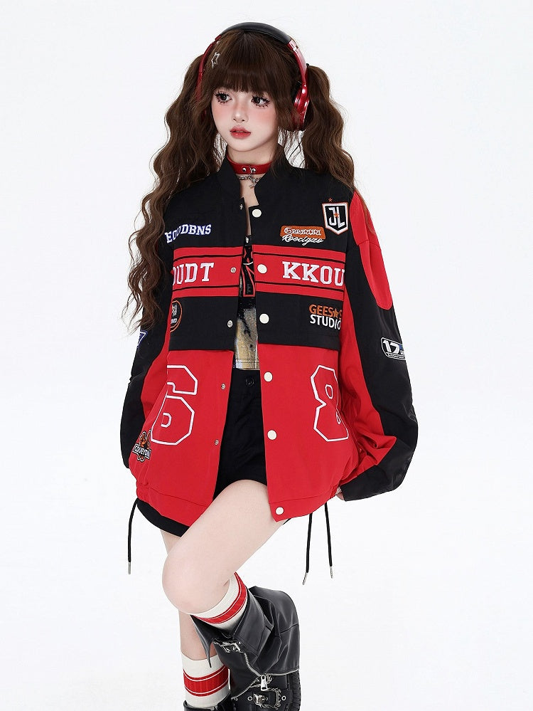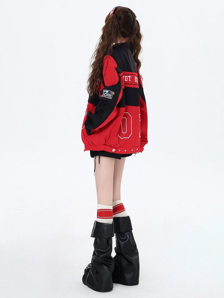 with Jacket Black Embroidery Fleece and Two-Way Baseball Letters Colorblock Detachable Red