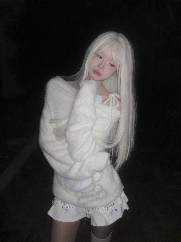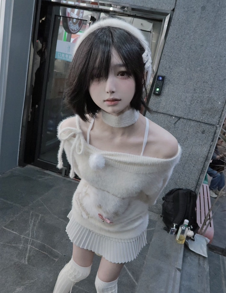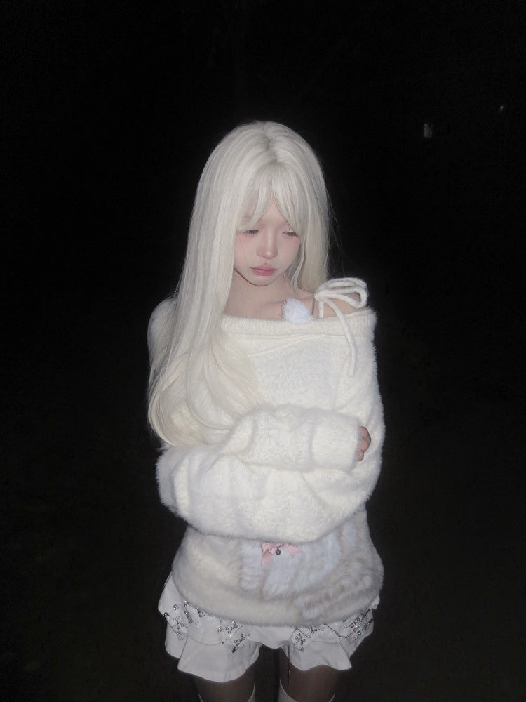 with Plush Pink Sweater Bow Off-Shoulder Beige Kawaii Puppy Details Bell