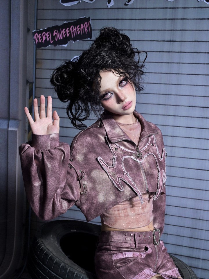 Dusty Pink Y2K Pastel Punk Distressed Denim Crop Jacket with Cutout Heart Applique & Bishop Sleeves