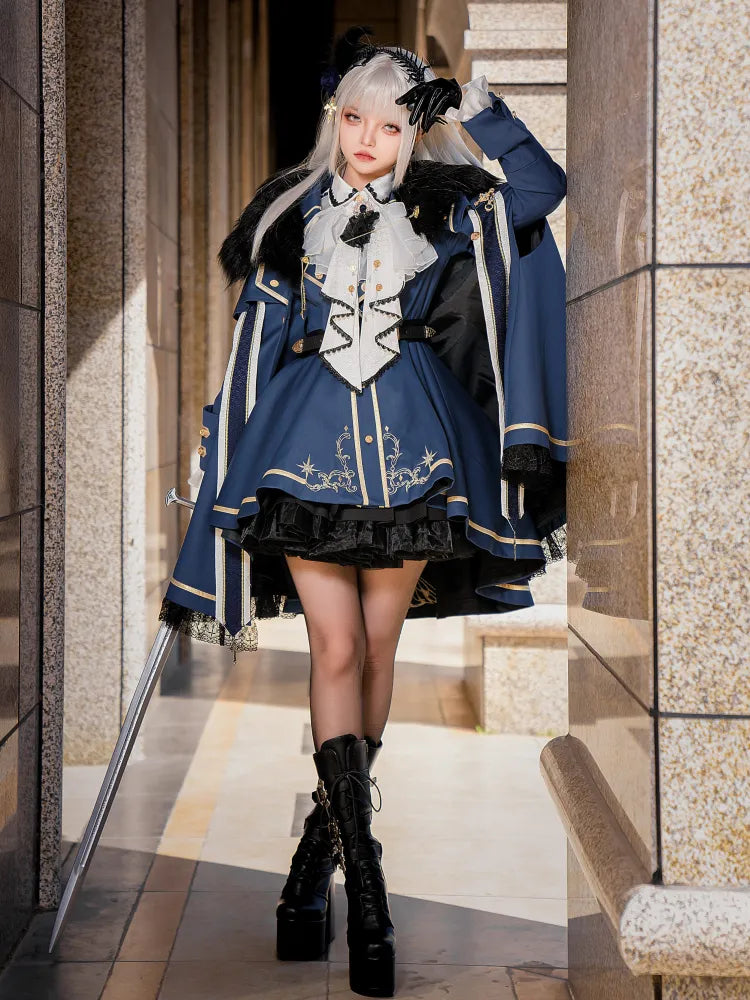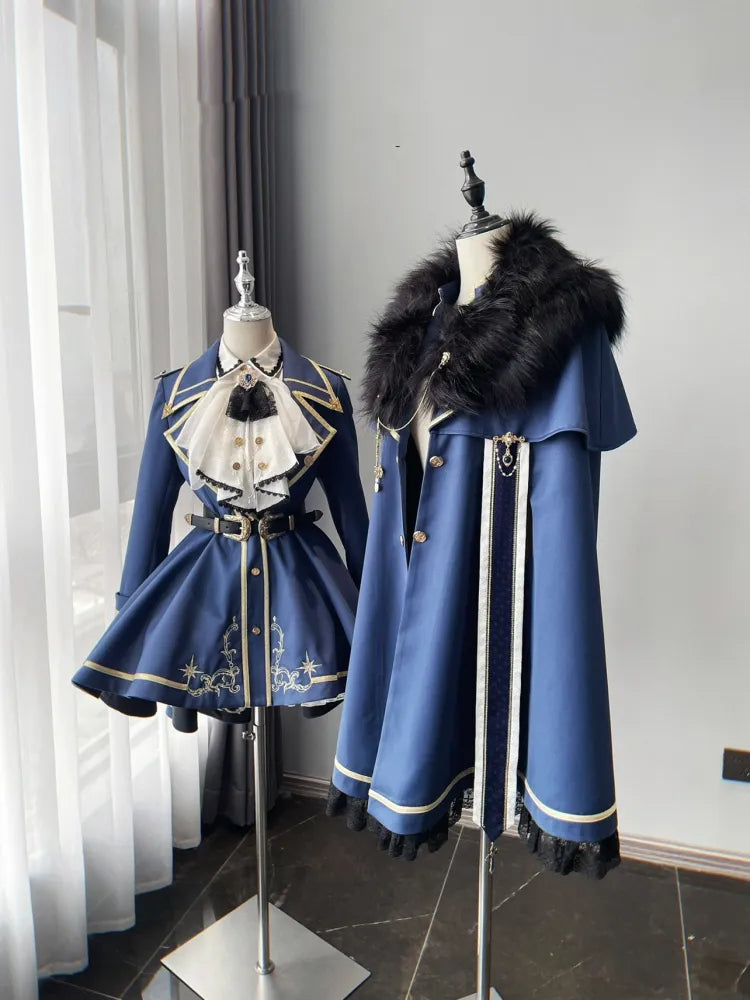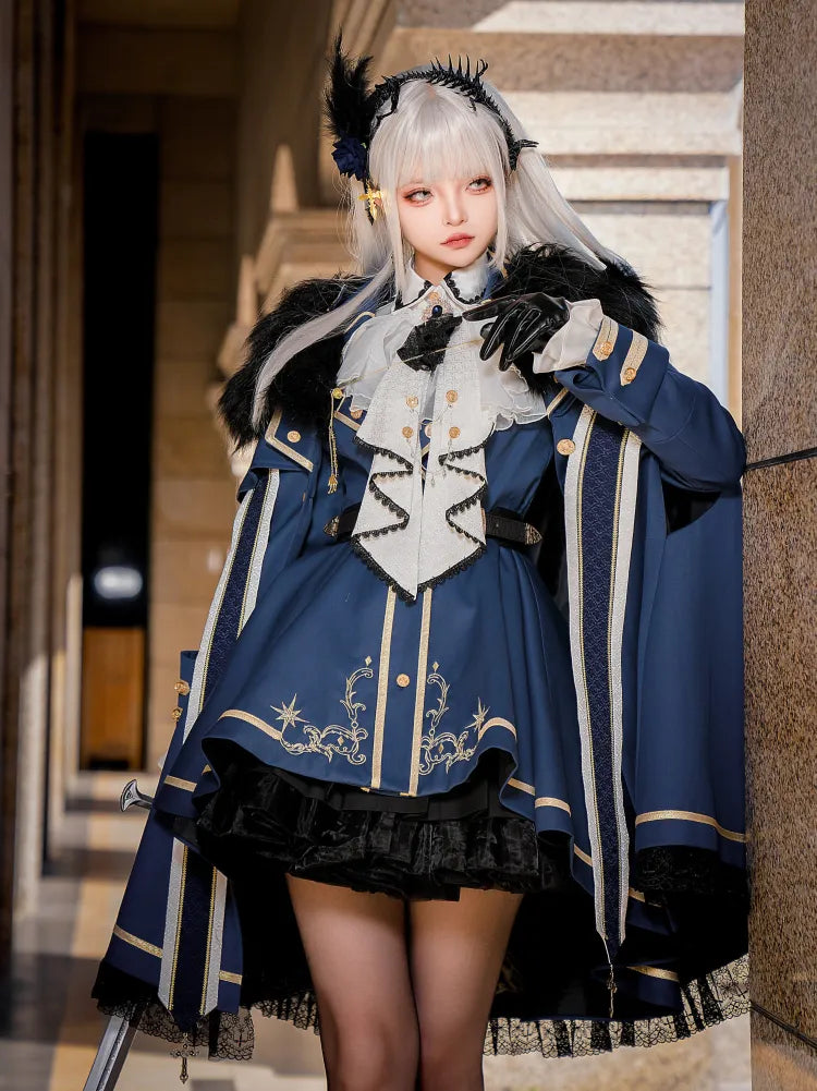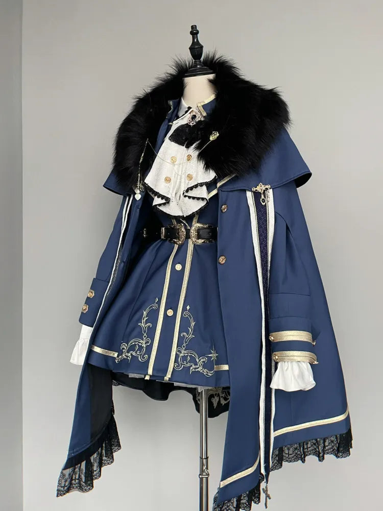 クリアランスサイズ XXL ブルー&ゴールドトリミング ミリタリーロリータ フルセット シャツ + コート + ケープ + ジャボ + スカート