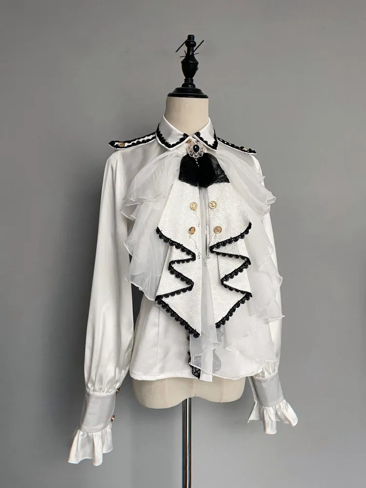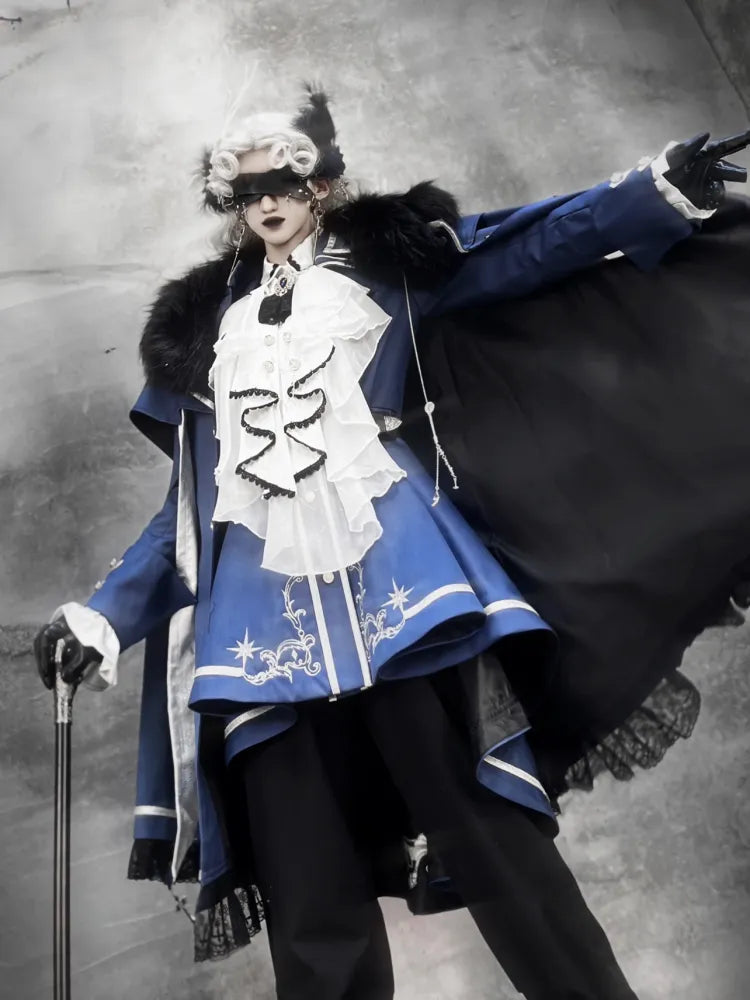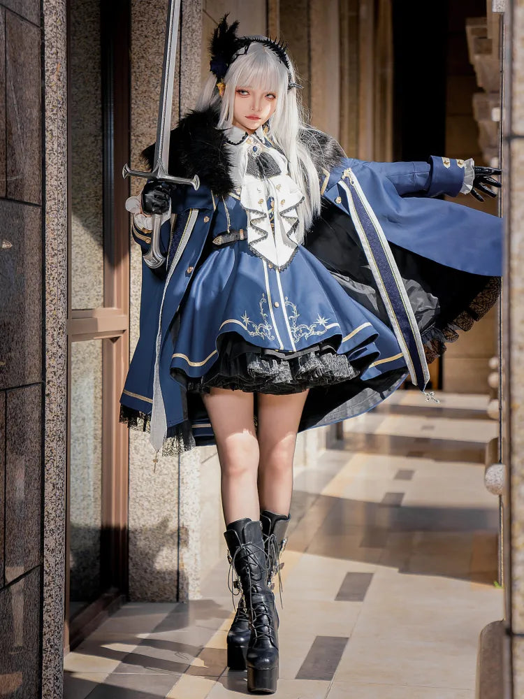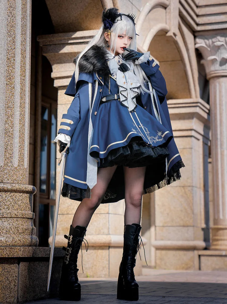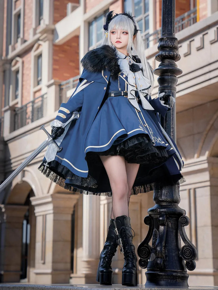クリアランスサイズ XXL ブルー&ゴールドトリミング ミリタリーロリータ フルセット シャツ + コート + ケープ + ジャボ + スカート