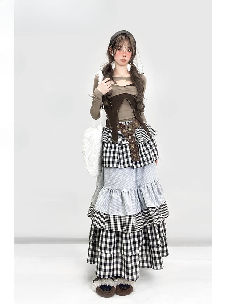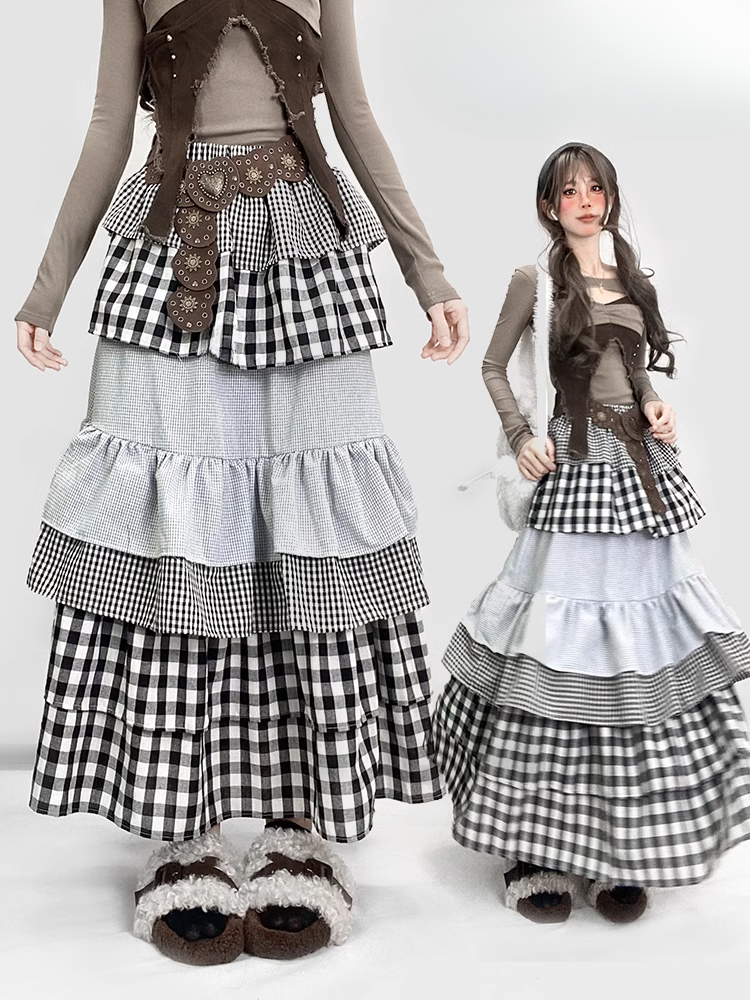 Y2K ブラック&ホワイト チェック柄 アンクル丈 ティアードスカート