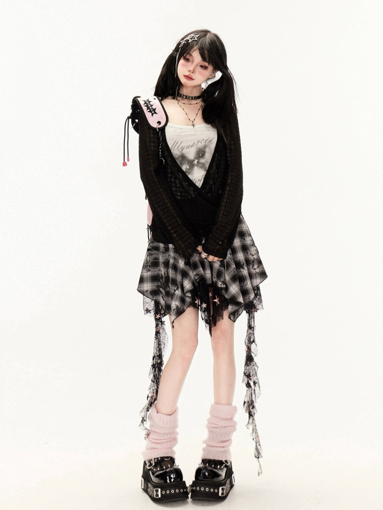 Y2K 黒と白のチェック柄ハンカチ裾カスケードフリルメッシュ