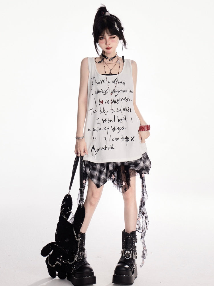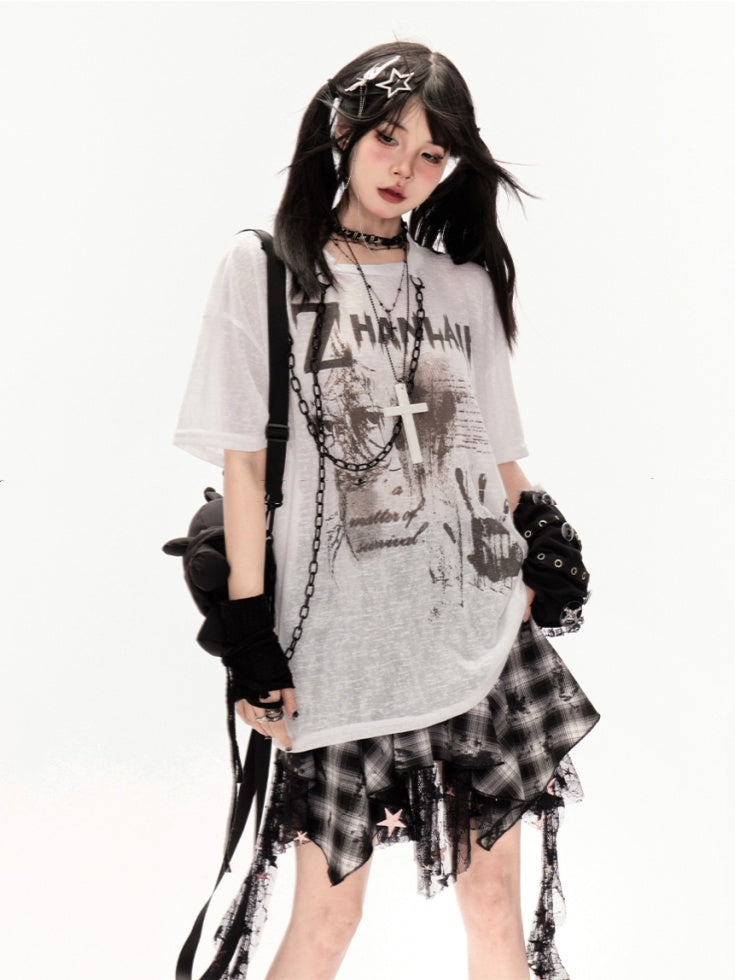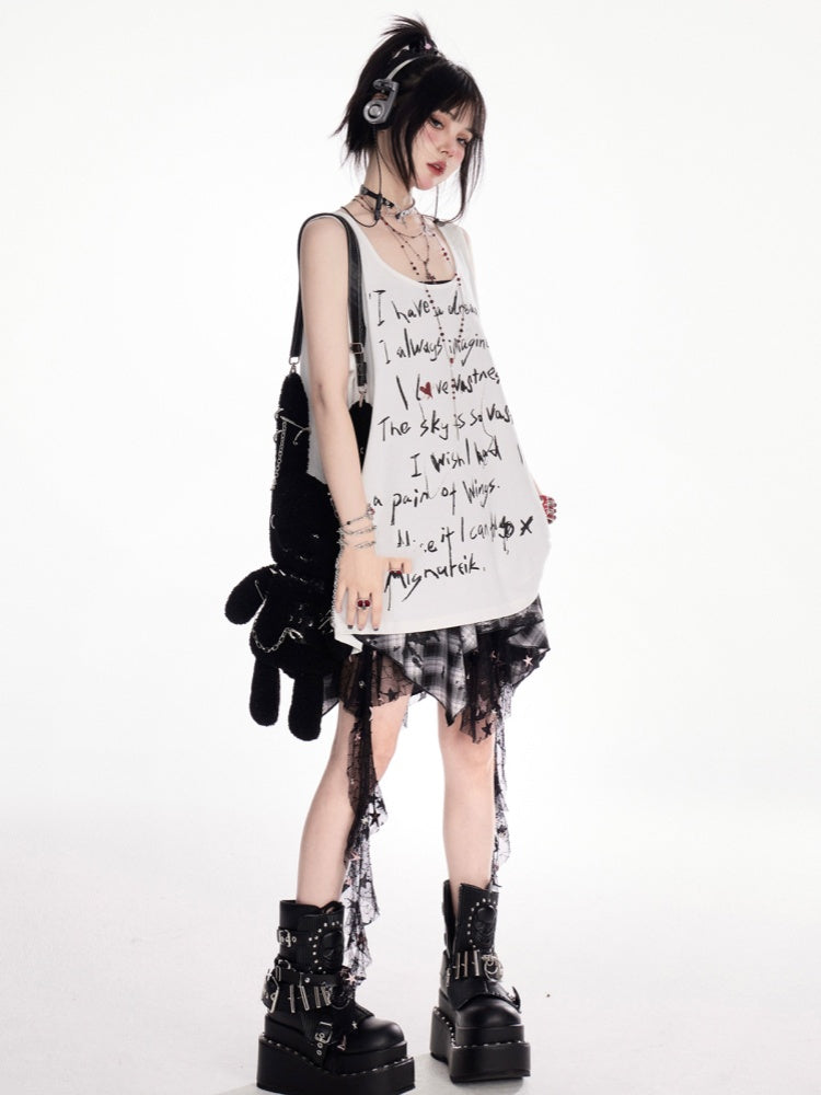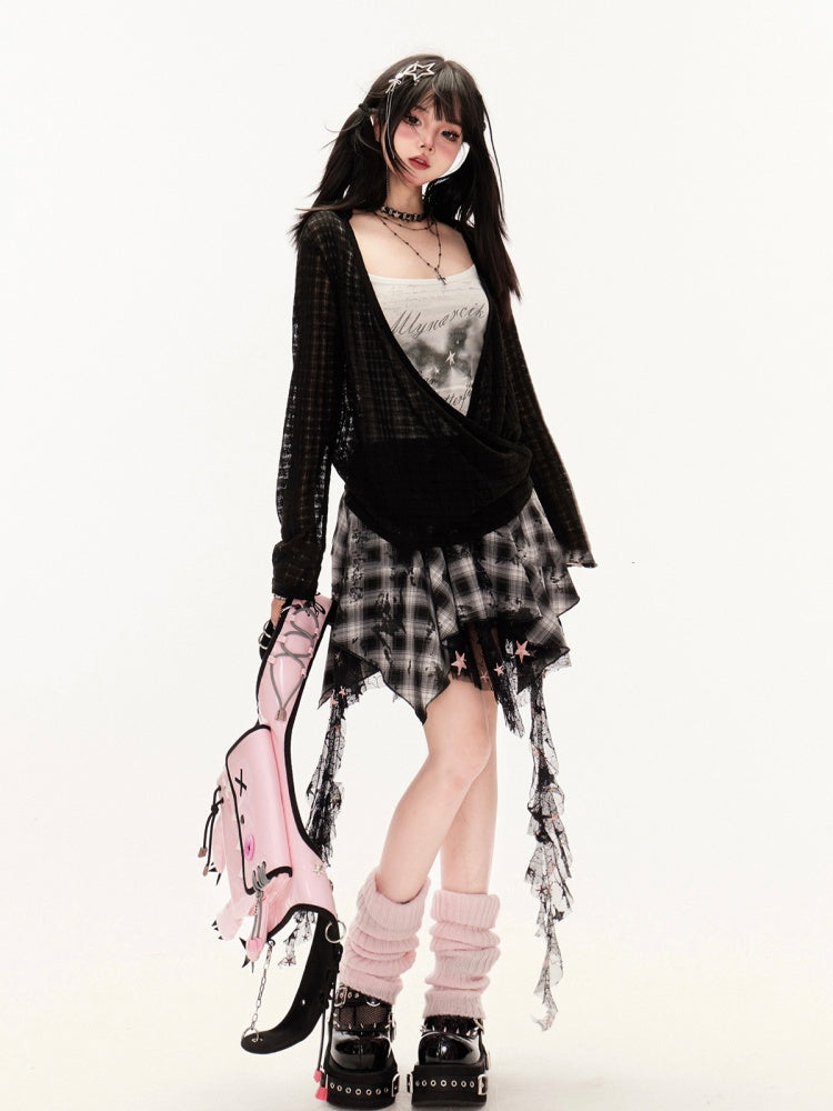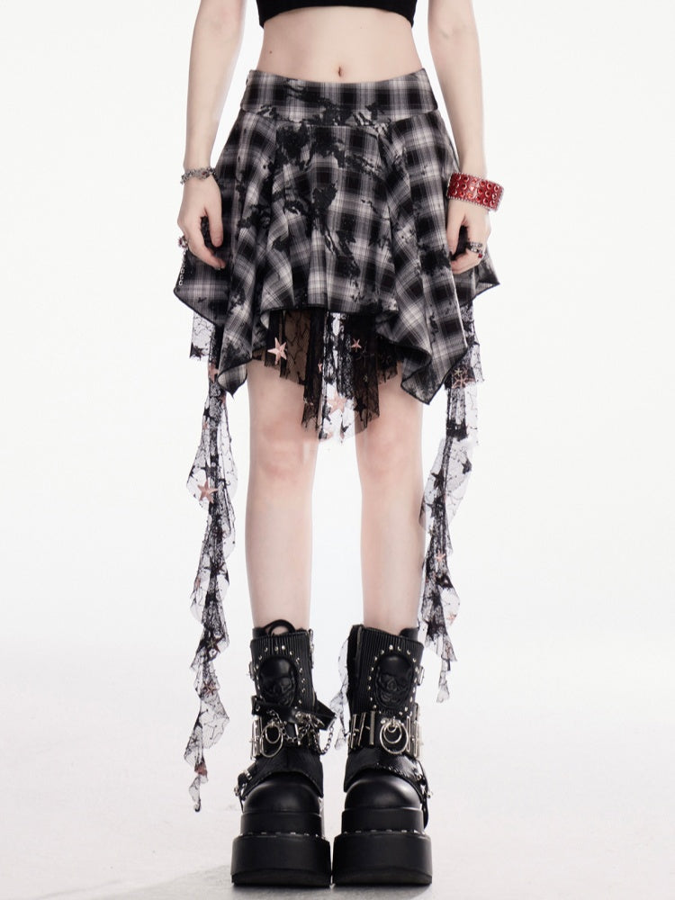 Y2K ブラック&ホワイト チェック柄 ハンカチ裾 カスケードフリル メッシュスカート