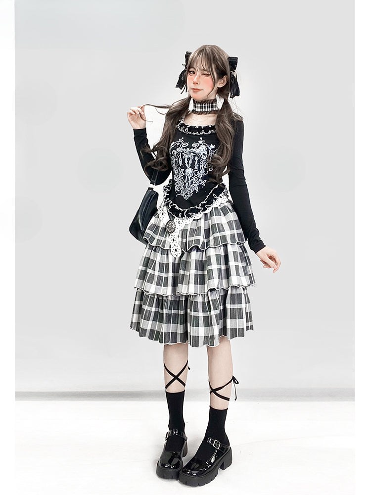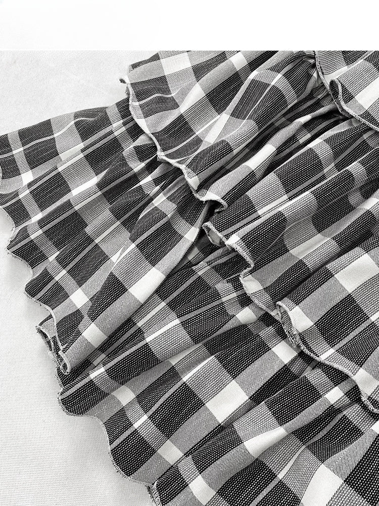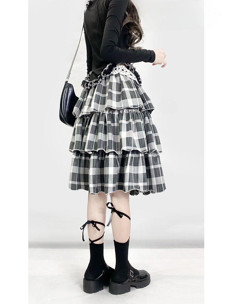 Y2K ブラック&ホワイト チェック柄 ハイウエスト 膝丈 グラマラス ティアードスカート