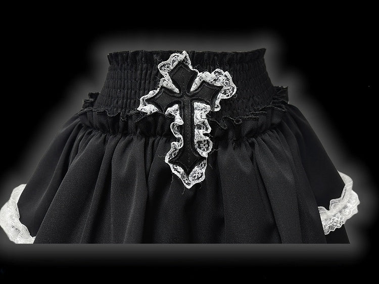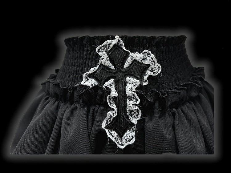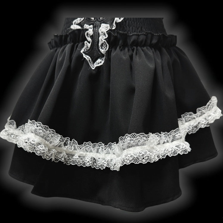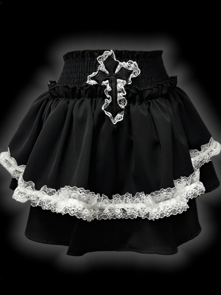 Y2K ブラッククロスアップリケ レースアクセント パンク ティアード ミニスカート