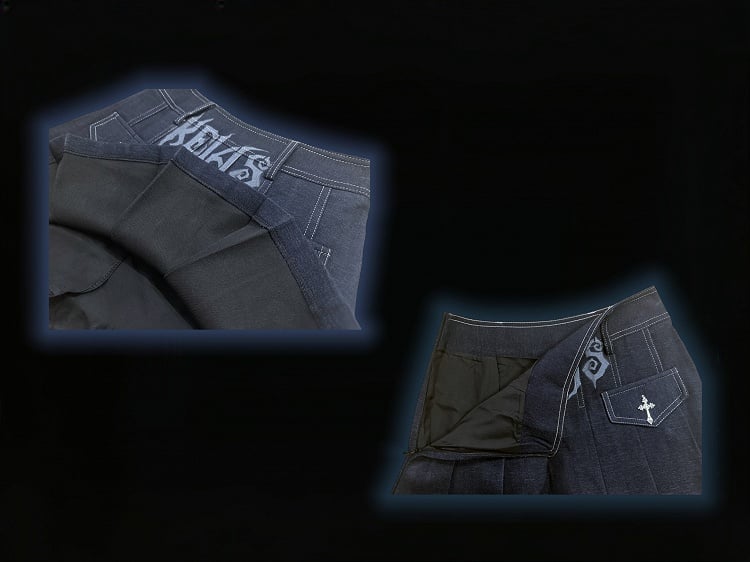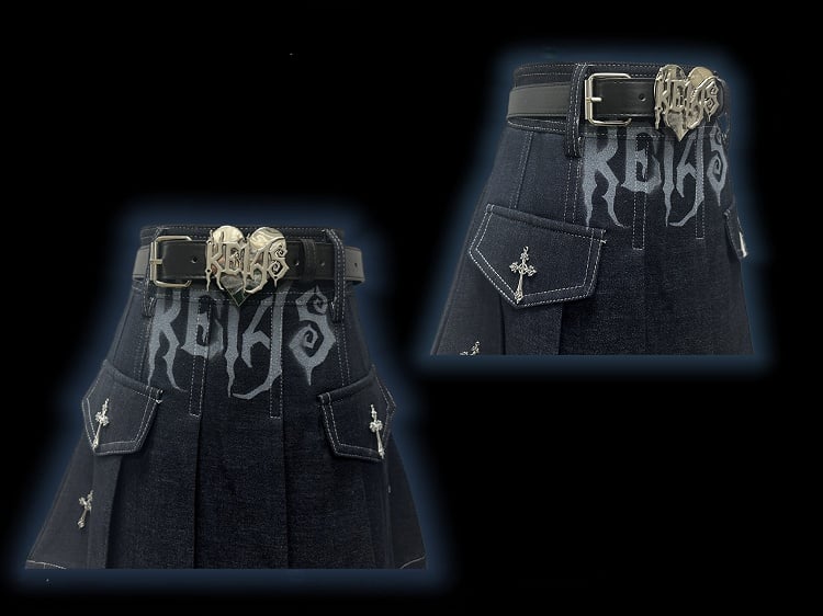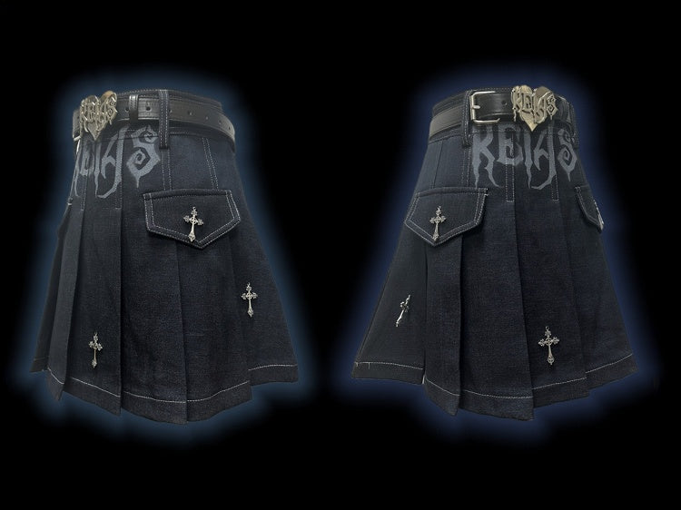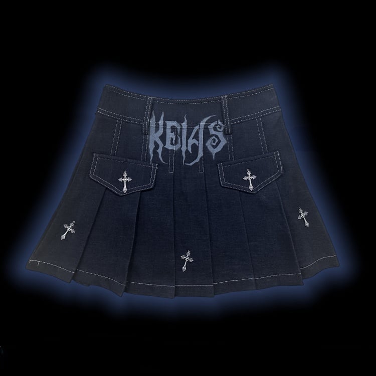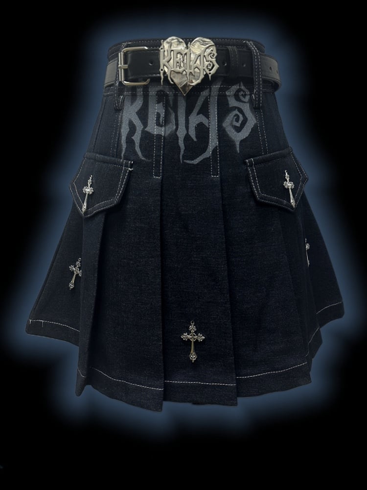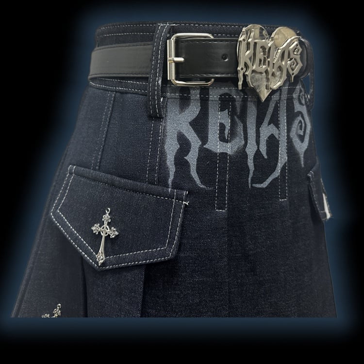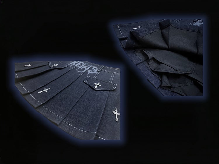 Y2K ダークブルー文字 クロスチャーム パンクロック デニム プリーツスカート