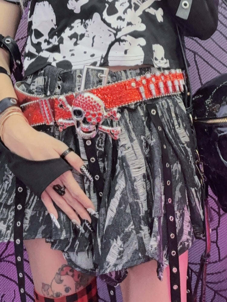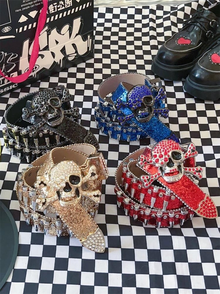 Y2K キラキラ輝くラインストーン パンクスカル弾丸ウエストベルト