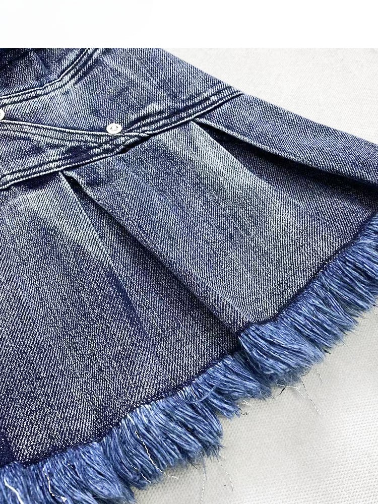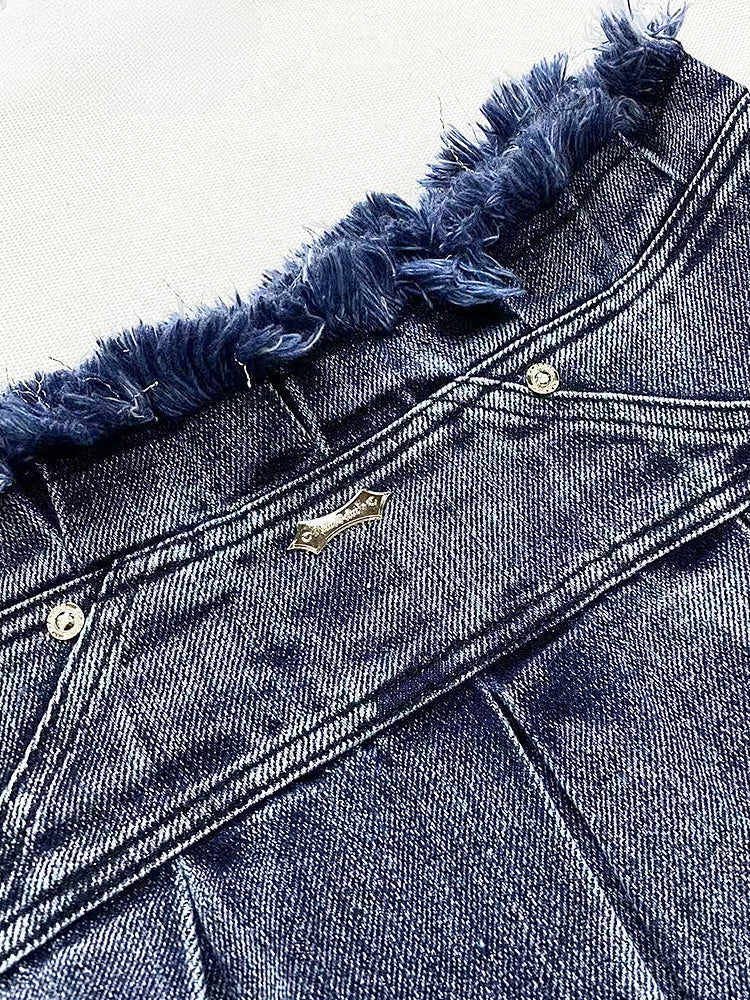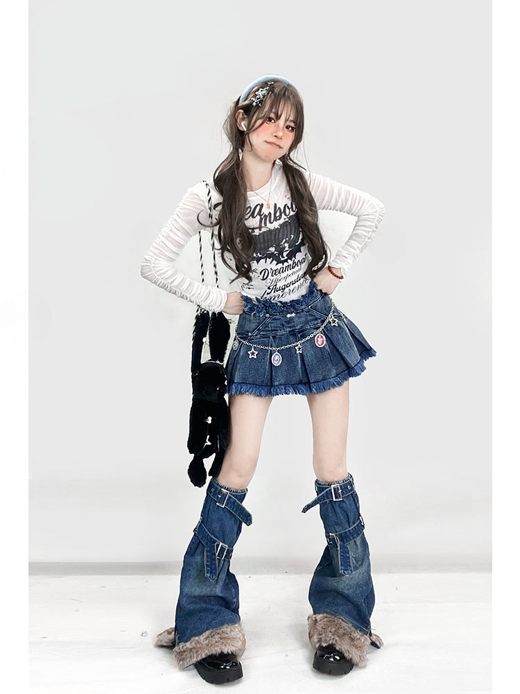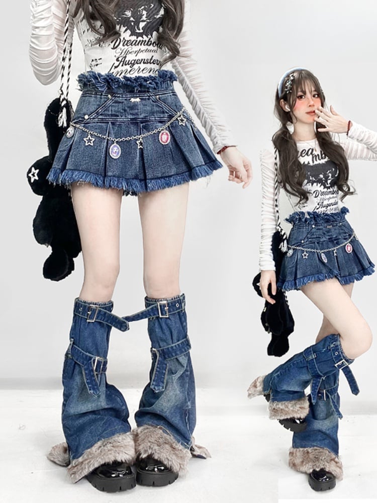 Y2Kヴィンテージ ダークブルー ディストレストトリム デニム グラマラススカート+バックルストラップ プラッシュトリム レッグウォーマー