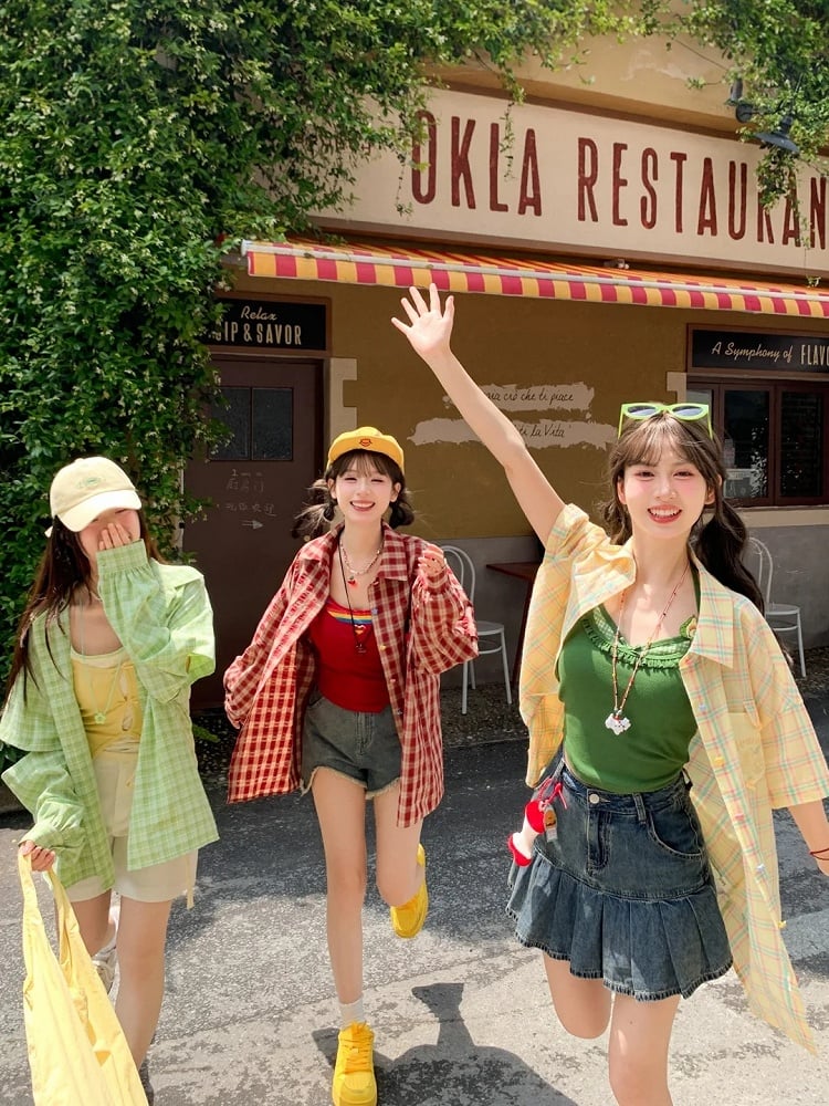 イエローのフェイクツーピースキャミソールトップスとグリーンのチェックシャツセット