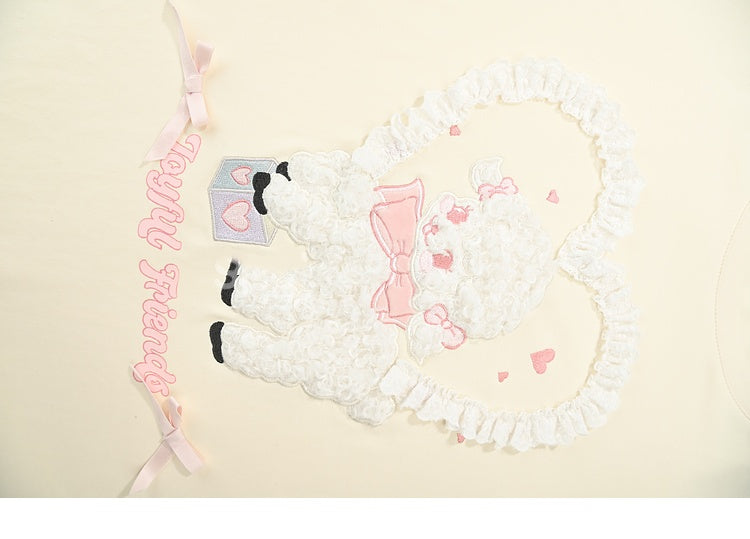 クリーミーイエローのプラッシュラムアップリケフリルハートルーズTシャツ