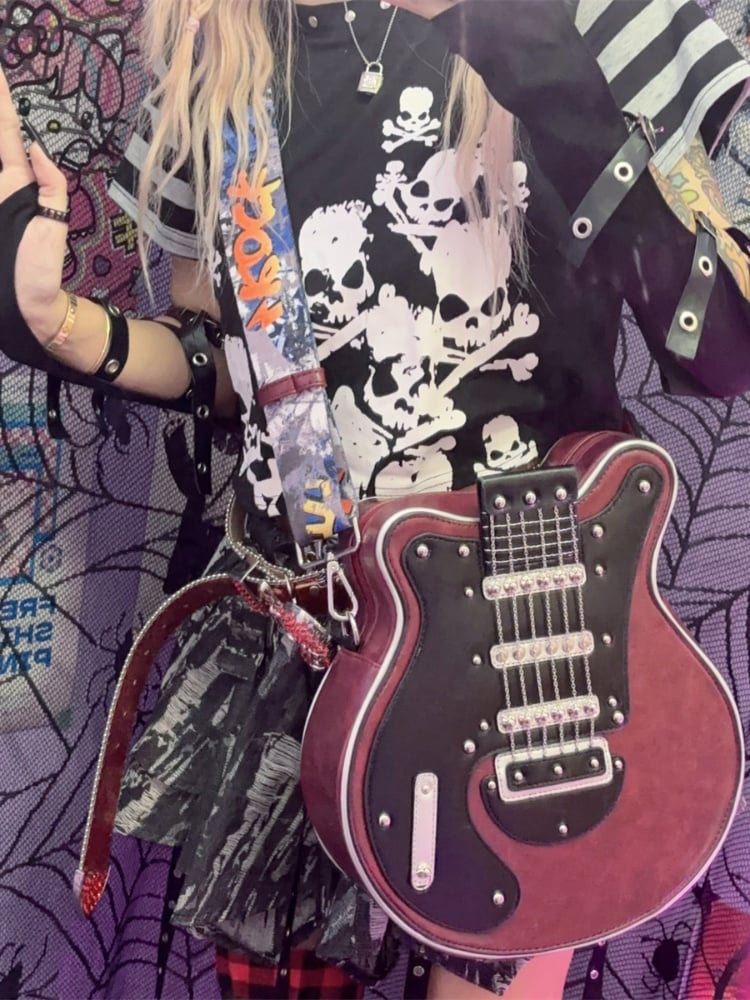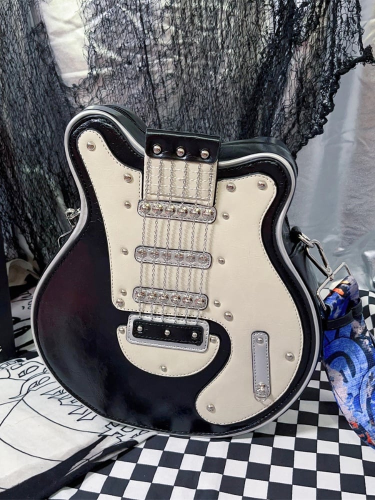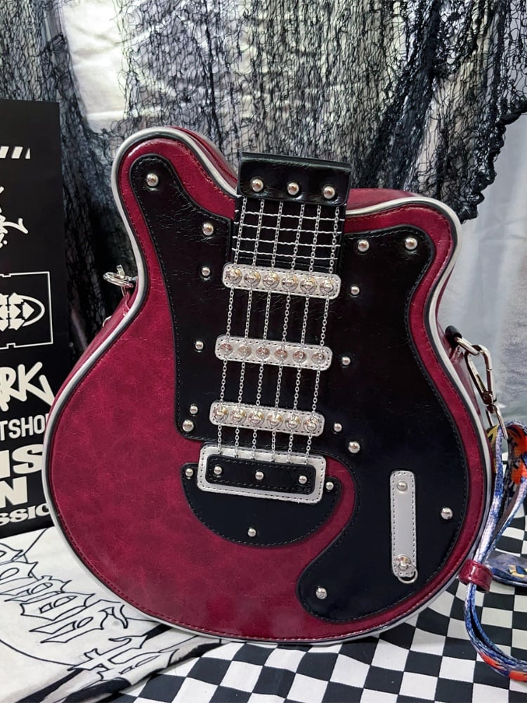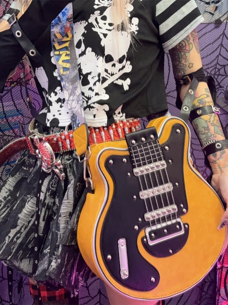イエロー/レッド/ブラック&ホワイトのギター型クロスボディバッグ