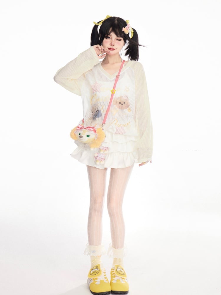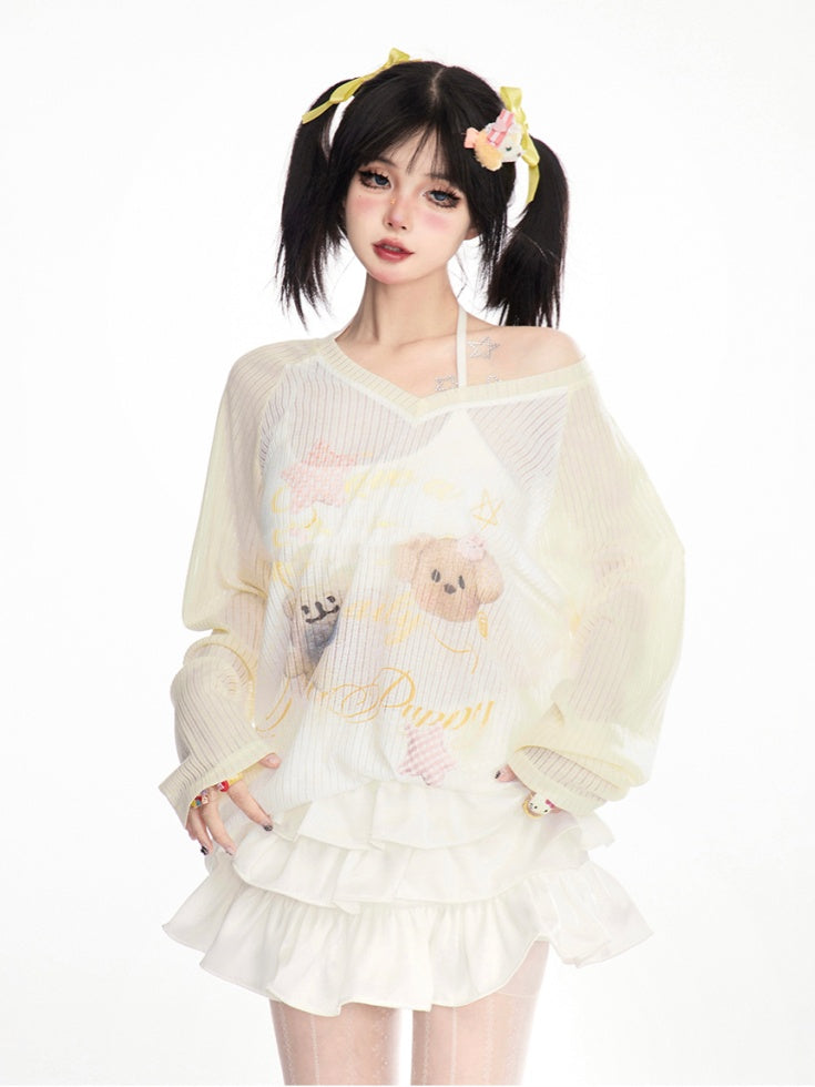 イエローのカラーブロックデザインVネック、キュートなクマ柄セミシアーカバーアップ