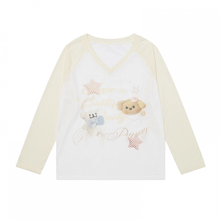 イエローのセミシアーカバーアップデザイン ベアプリント Vネック キュートカラーブロック