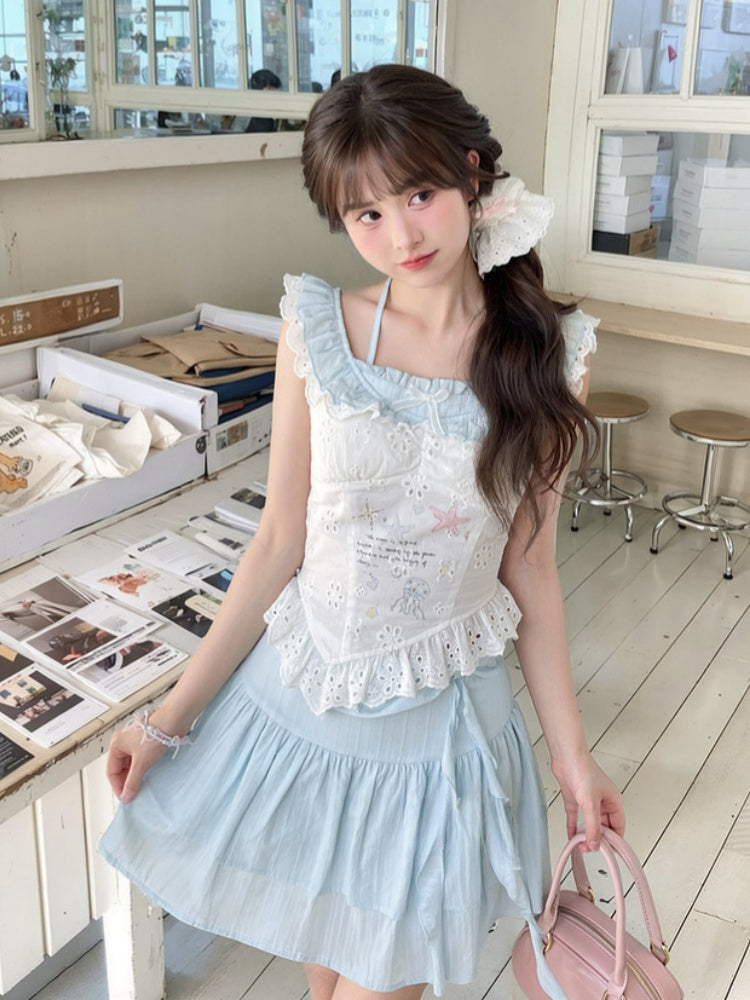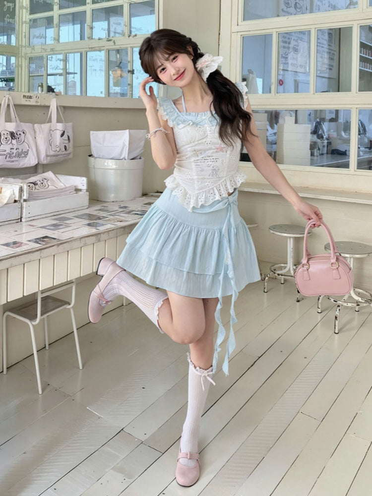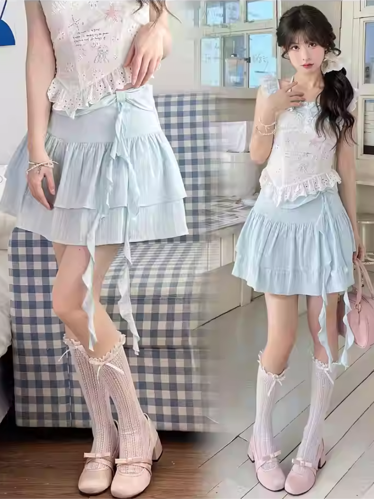 ゆめかわいいブルーのリボンディテールウエストティアードスカート