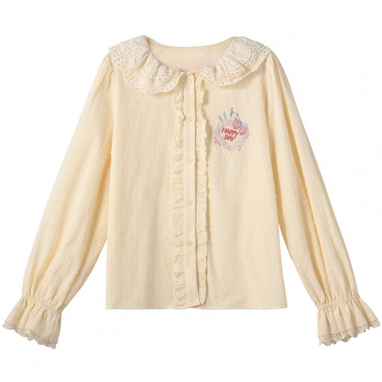 ゆめかわいいストロベリーケーキ刺繍入りクリーミーイエローレースピーターパンカラーブラウス