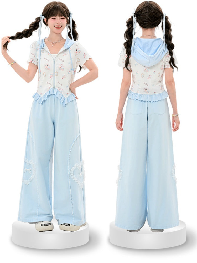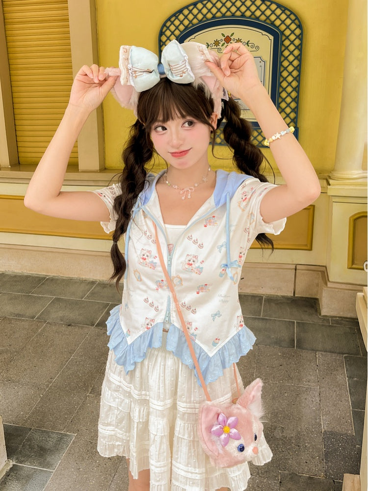 ジップアップフード付きキュートなキティプリントカーブヘムレースブルートリムTシャツ