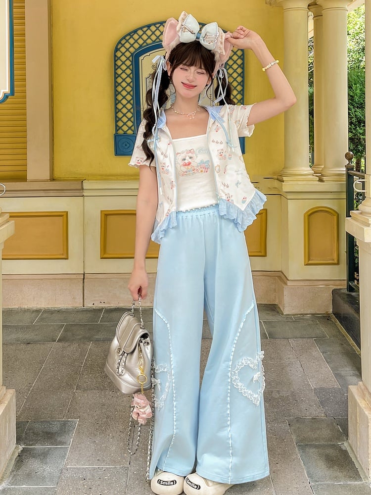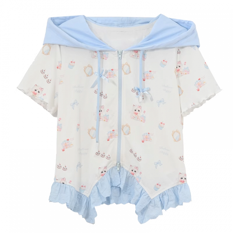 キュートなキティプリント、カーブヘム、レーストリム、ブルー、ジップアップ、フード付きTシャツ