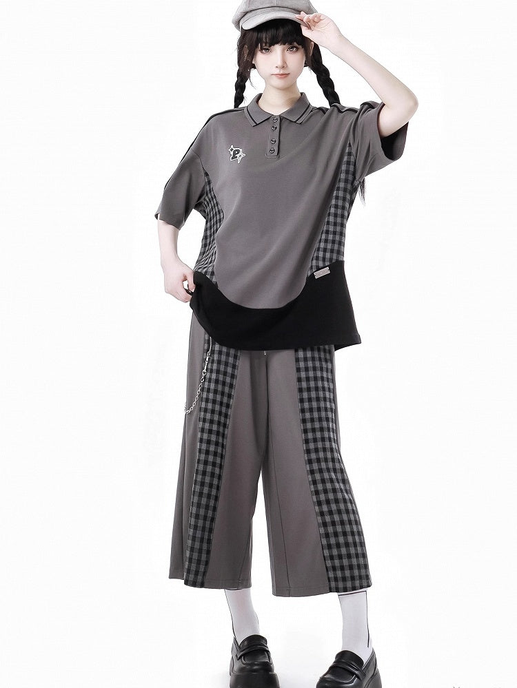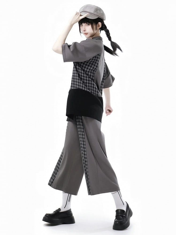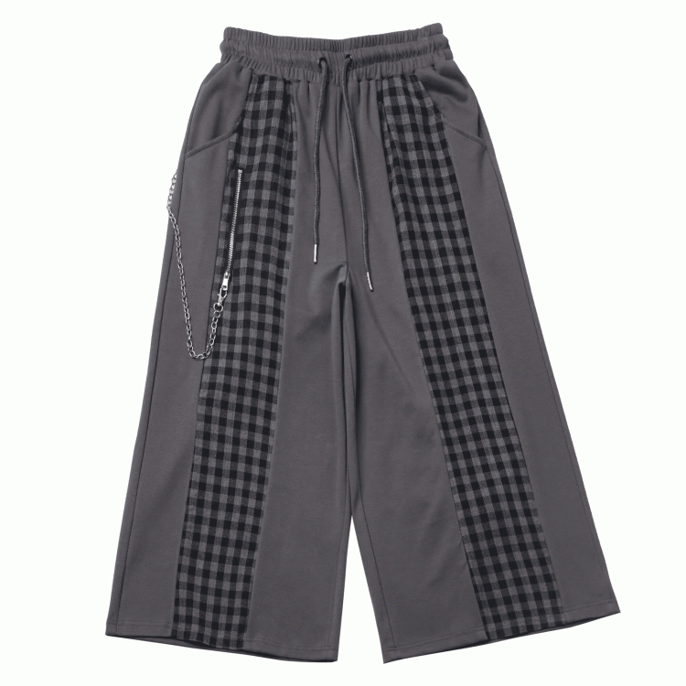 グレーのチェック柄パッチワークジッパーディテールドローストリングウエストパンツ