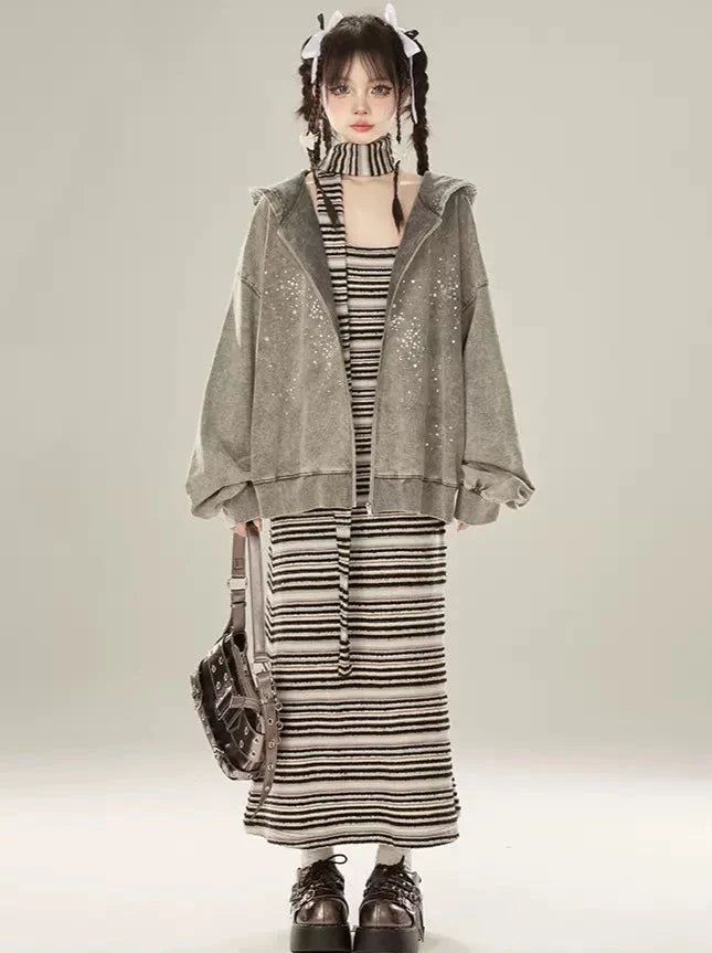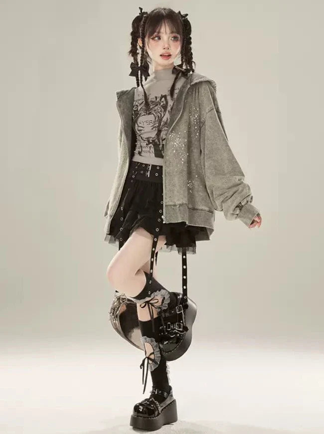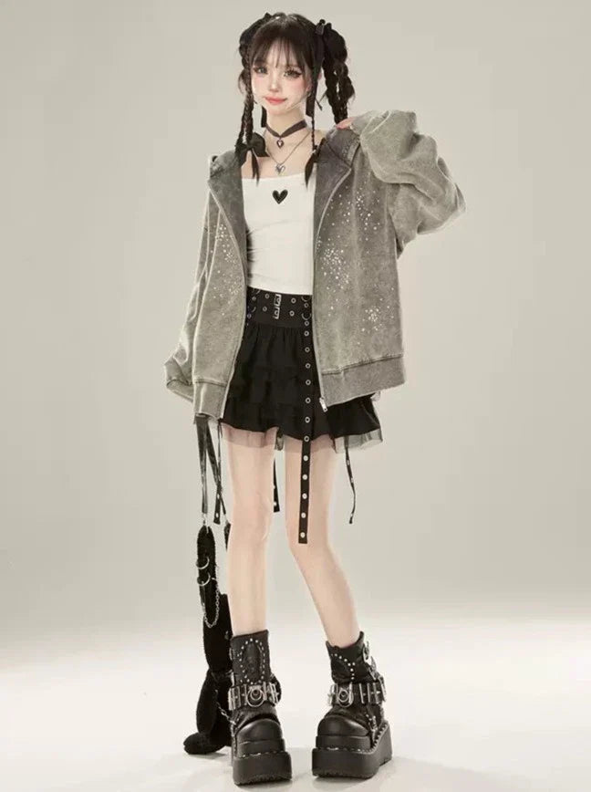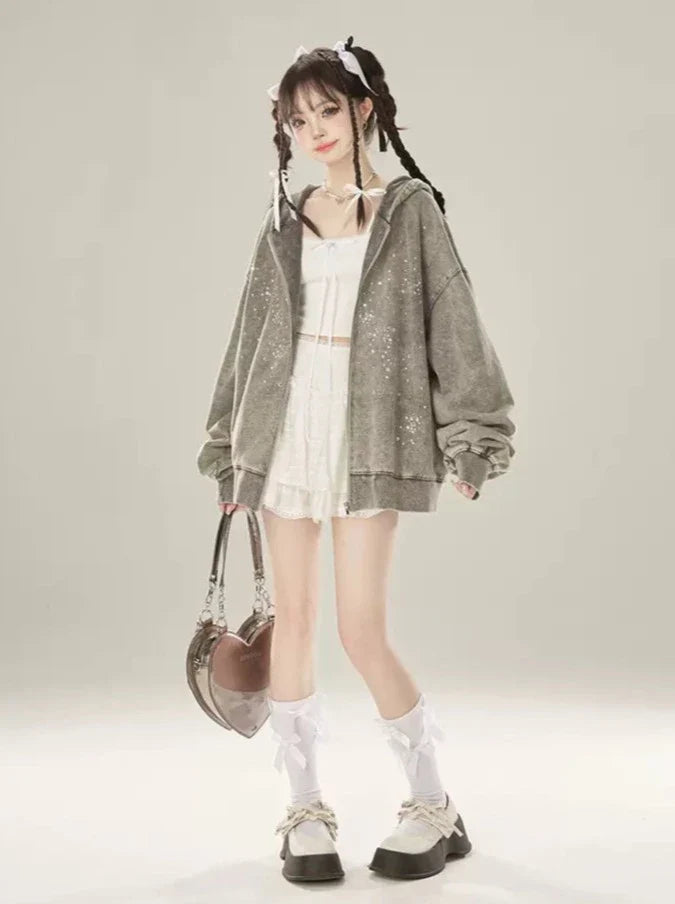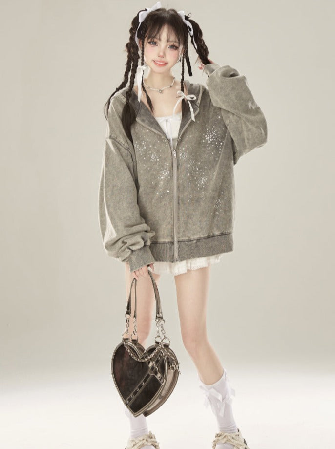 ジッパー付きフード付きダイヤモンドドゥルージーグレーパーカーライト