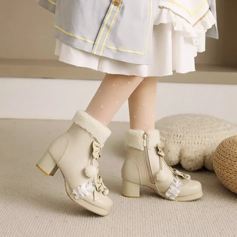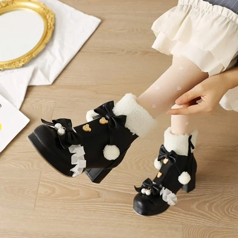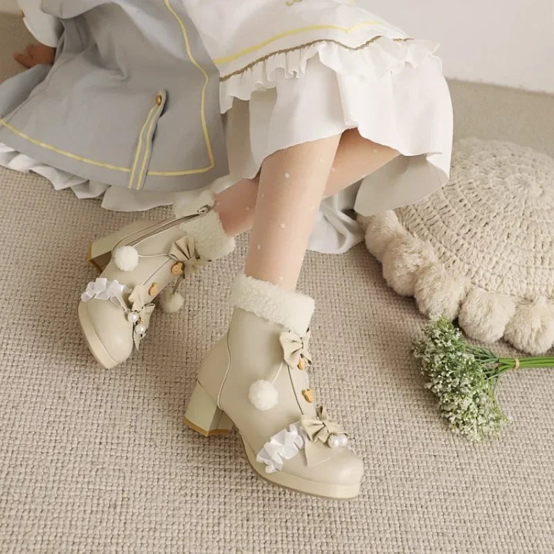 Step into whimsy with these enchanting pink Lolita boots, where charm meets comfort. Featuring delicate bow knot details and fluffy pompom accents, these faux fur beauties deliver that coveted kawaii aesthetic. The plush lining keeps your feet toasty warm through chilly days, while the playful design turns heads wherever you go. Perfect for adding a touch of magical elegance to your wardrobe, these boots are an instant mood-lifter for anyone who loves adorable, statement-making footwear.