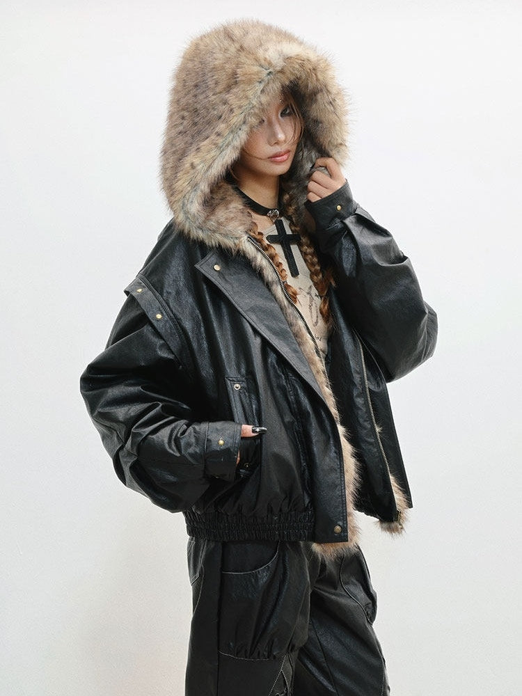 Accent with Jacket - Zip Snap Hooded Style Closure Punk Plush Details Black
