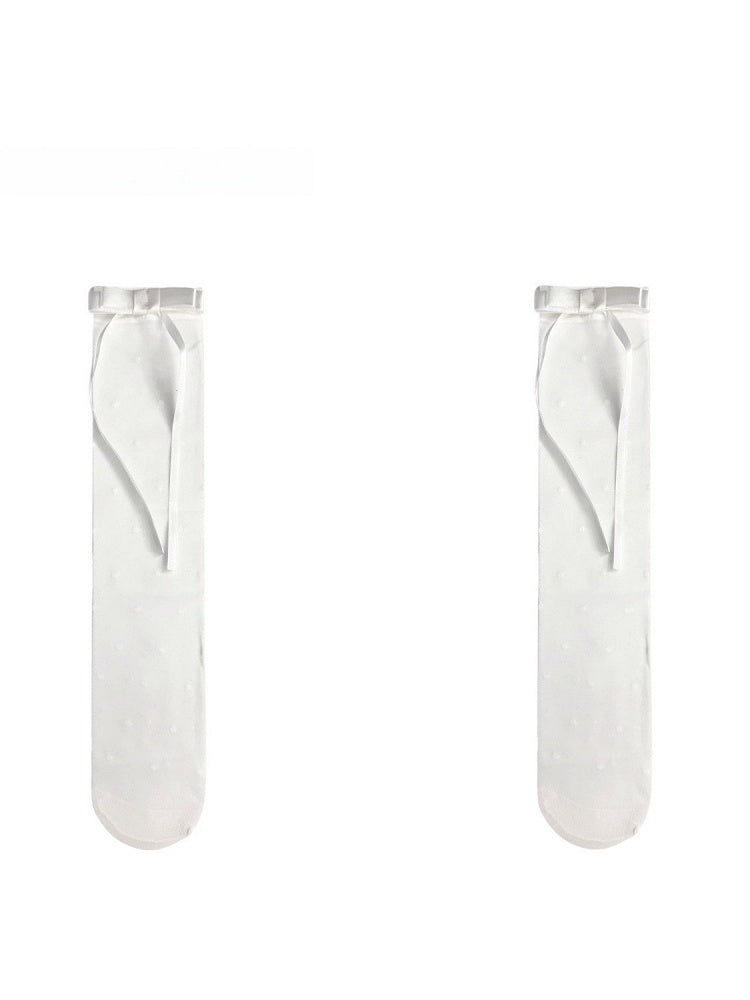 White Polka-dot Pattern Semi-Sheer Wide Cuff Calf Socks with Bowknot Accents
