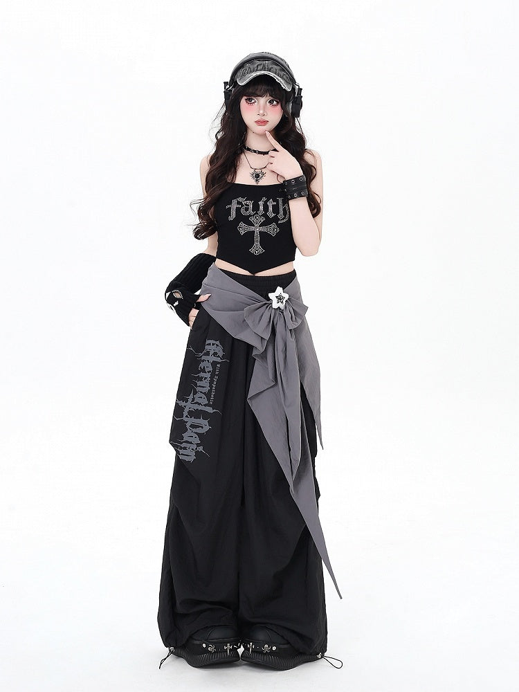 Black / Pink Low Waist Loose Fit Cargo Pants with Detachable Waist Accessory