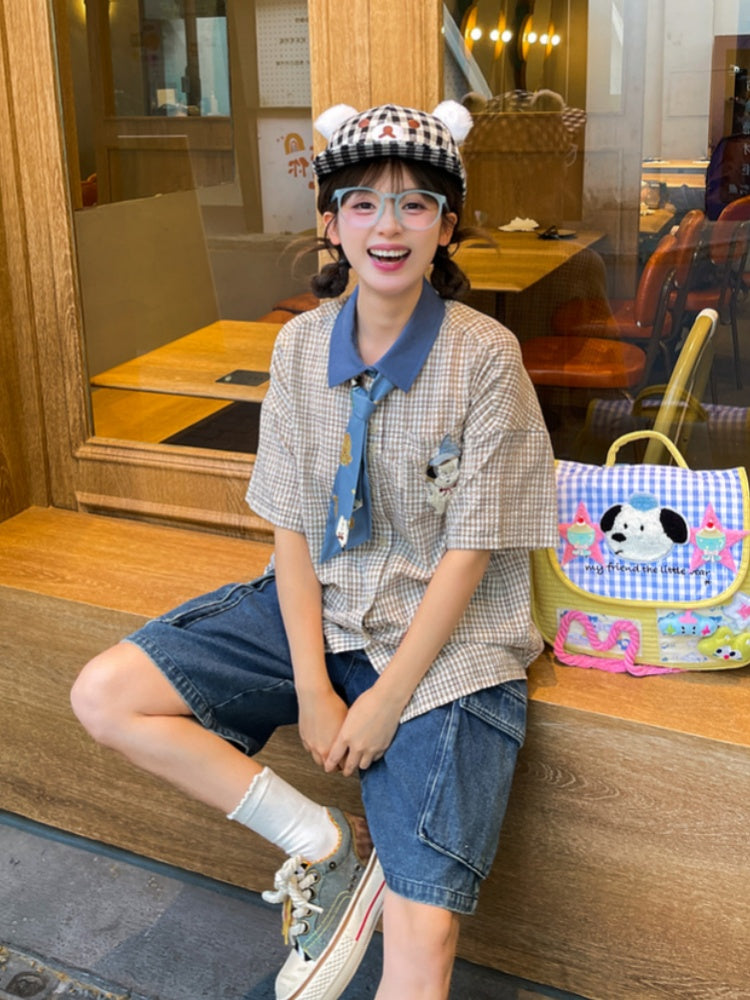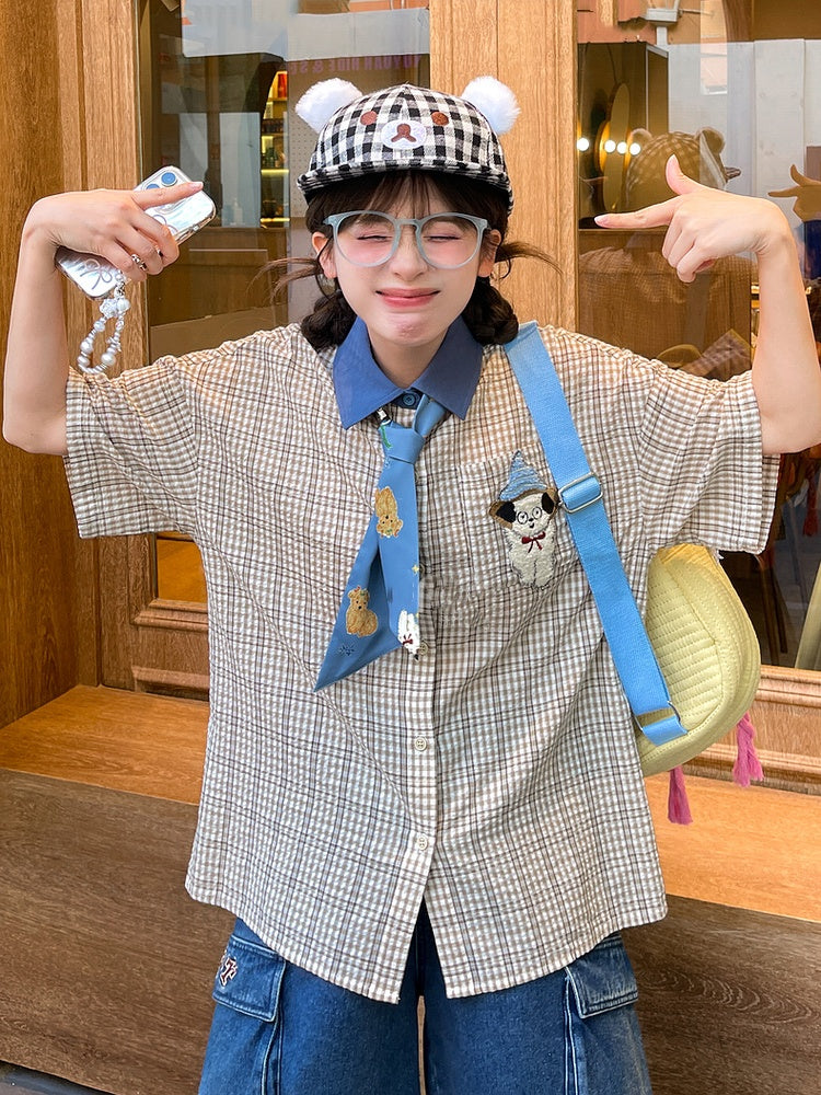 Adorable Puppy Embroidery Plaid Shirt with Tie Light Brown