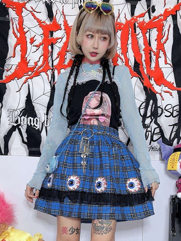 Y2K Blue Plaid Punk Skirt with Eye Embroidery and Lace Ruffle Trim