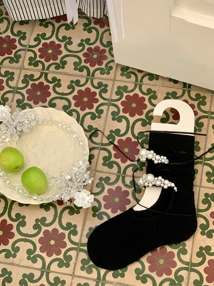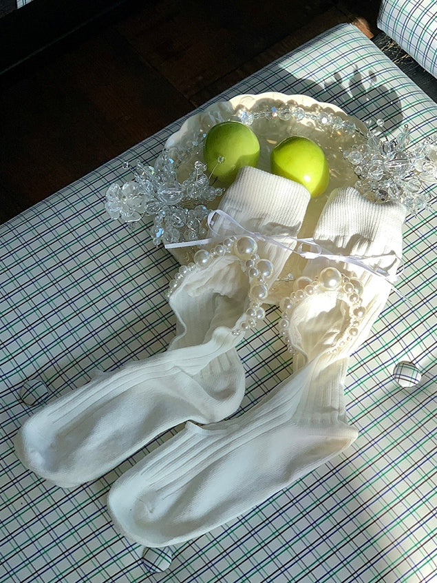 Black/White Cut-out Design Bowknot And Beaded Decorated Calf Socks