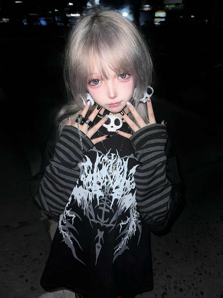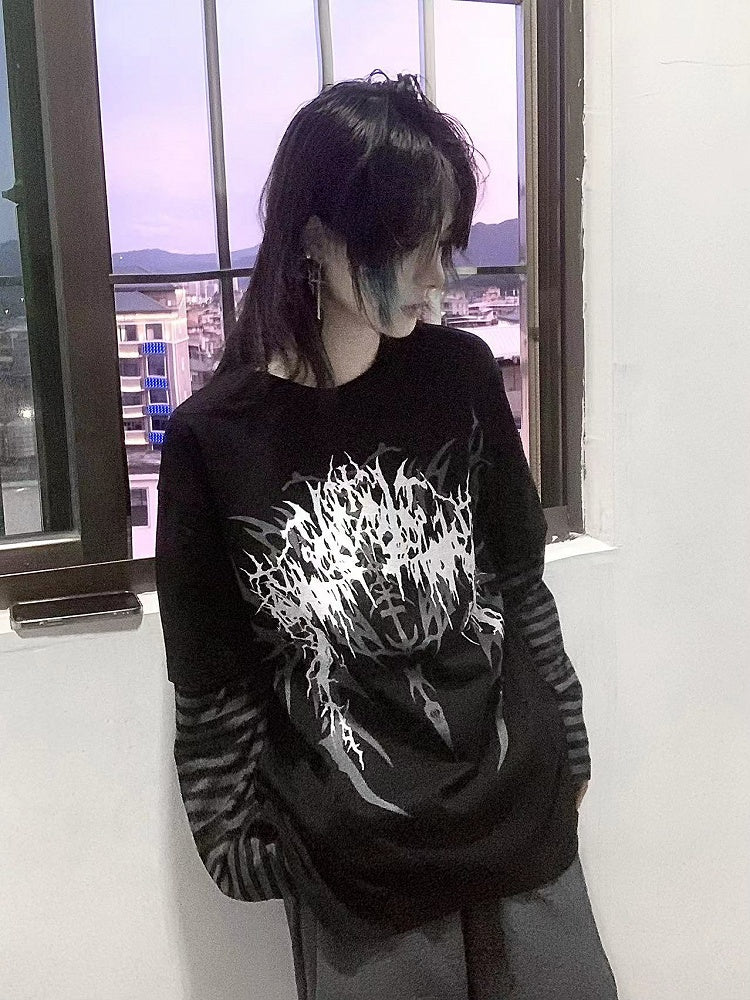 Gothic Black Faux Two-Piece Top with Striped Sleeves and Dark Fantasy Print