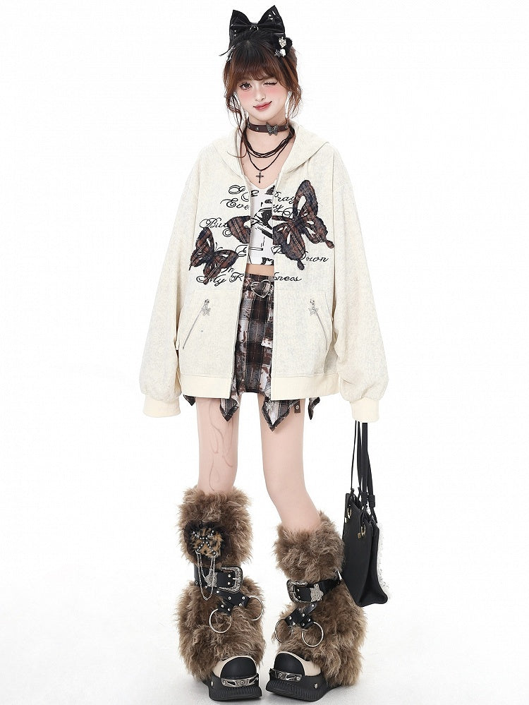 Apricot Butterfly Appliques Spring Loose Zip Hoodie