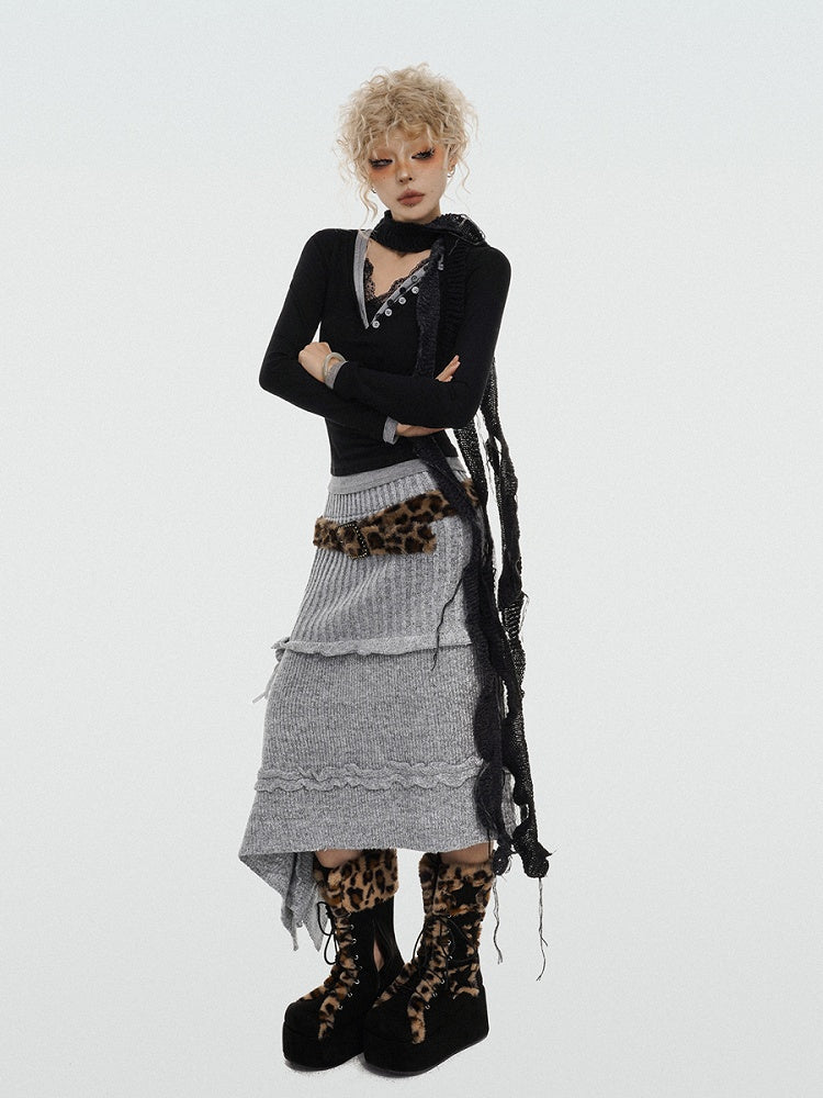 Asymmetrical Grey A-Line Knit Skirt with Rose Ribbon Detail