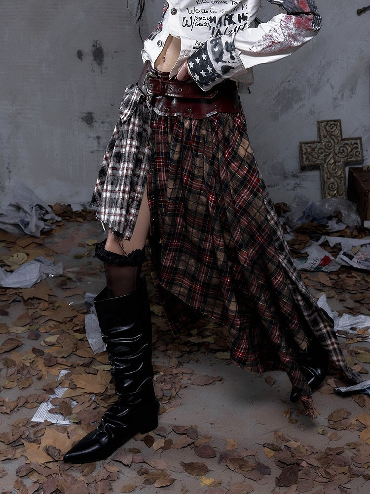 Vintage Punk Rock Dual Plaid Dark Red PU Waistband Skirt with Asymmetrical Triangular Hemline & Knotted Front Ties