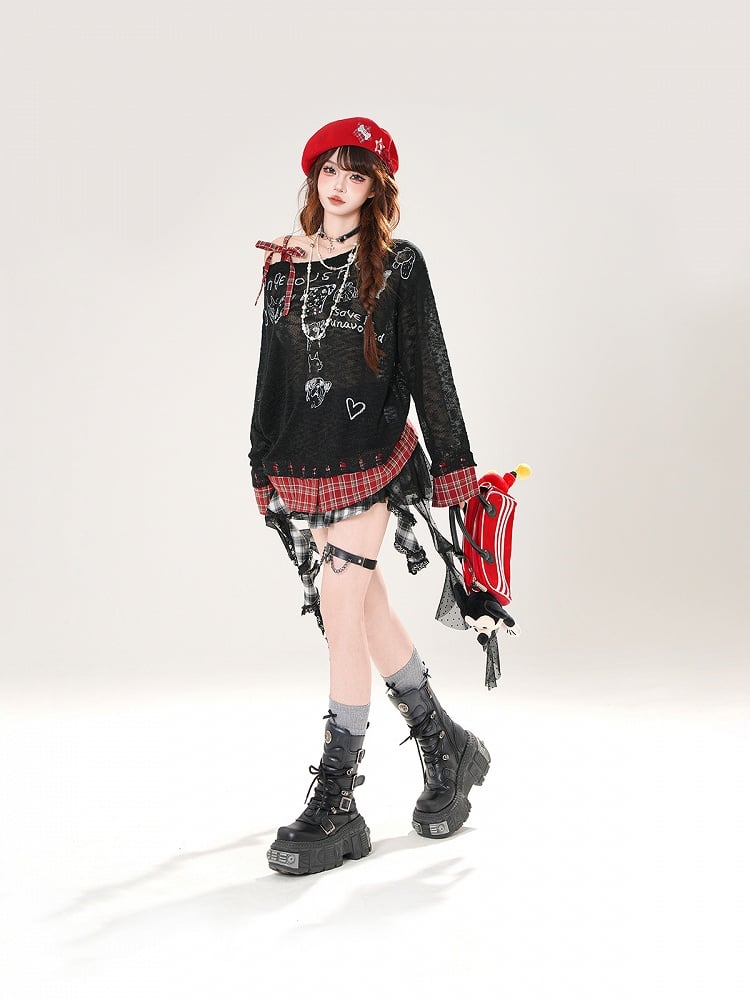 Asymmetrical Neckline Puppy Print Beige/Black Hem Plaid
