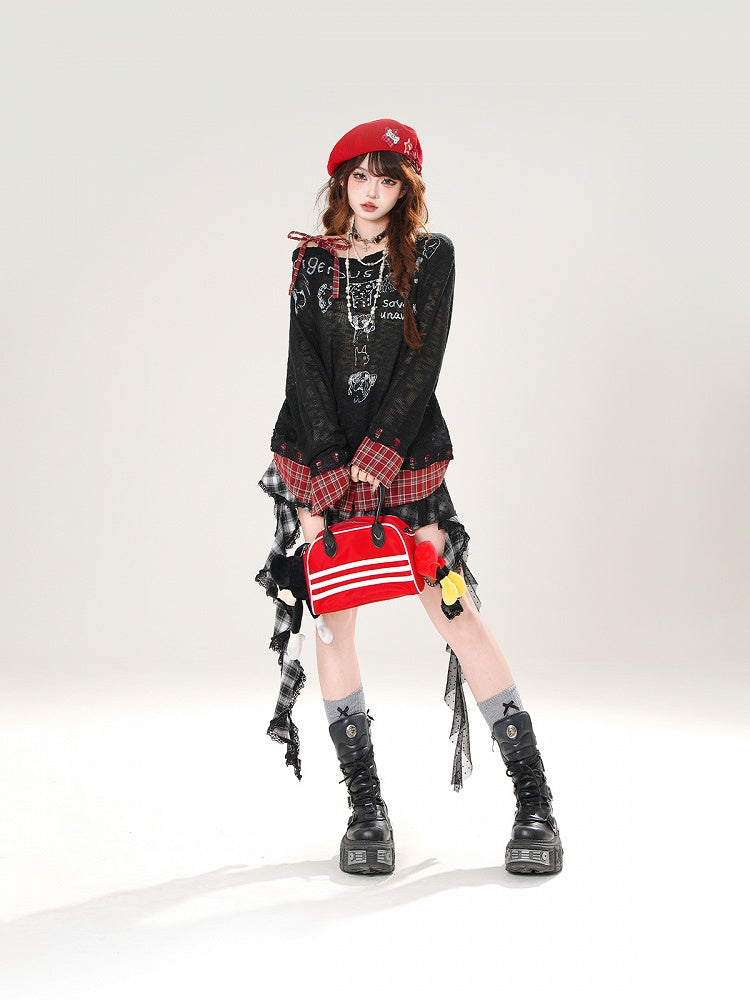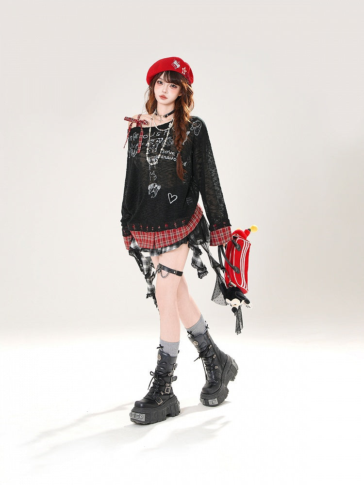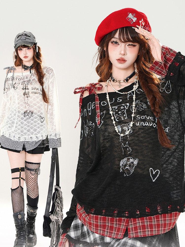 Asymmetrical Neckline Puppy Print Beige/Black Plaid Hem