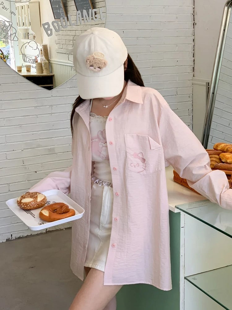 Back Shirt Kitty Embroidery on Pocket Kitty-shaped Detail Blue/Pink Loose Cutout