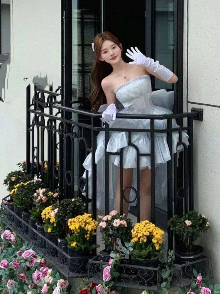 Balletcore Strapless Princess Puff Dress Sleeves Blue