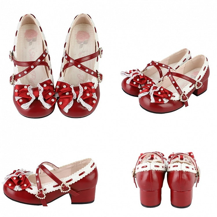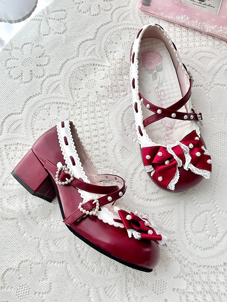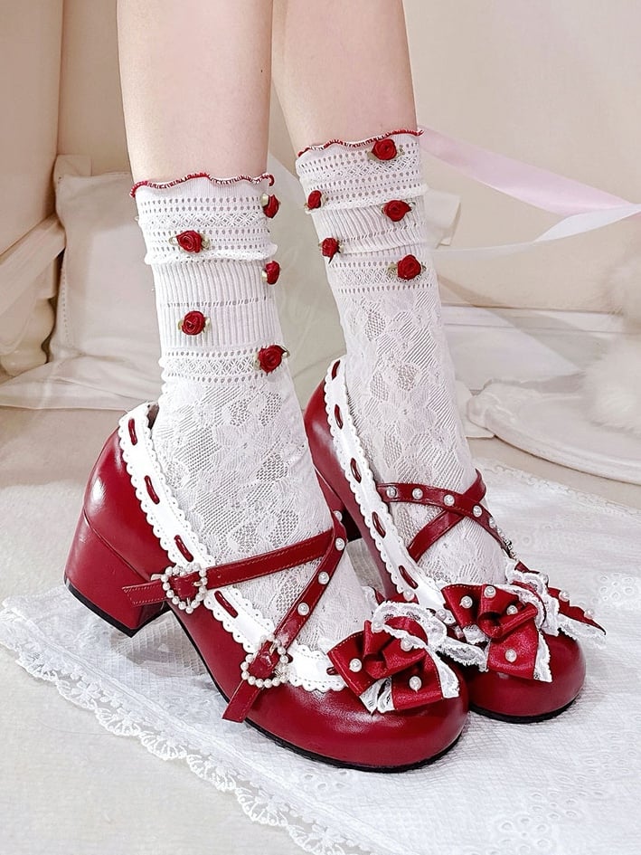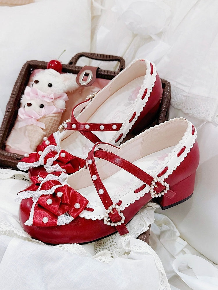 Intricate Beadwork, Lace-Edged Bow & Scalloped Trim with Crisscross Detail PU Red Mid-heel Shoes in Elegant Loltia