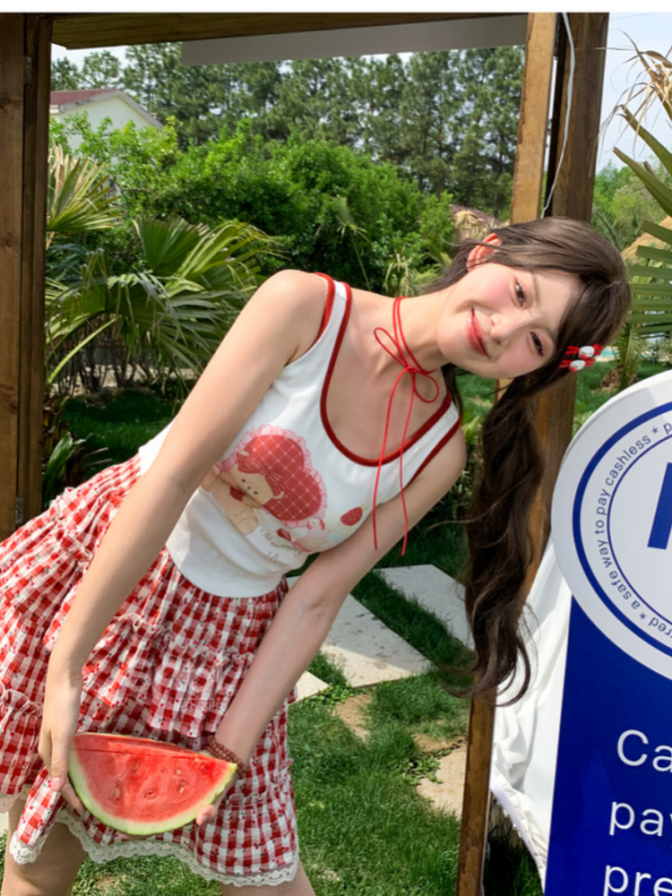 Bear Sweet White Adorable Trim Tank Top Contrast Red Print