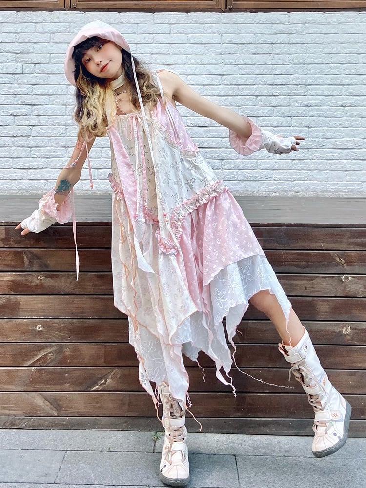 ● Cutout Detail / Double Edge Ruffle / Floral Print / Patchwork Design / Ruffle Trim / Thin Shoulder Straps