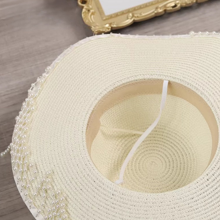 Beige Vintage Lolita Pearl Tassel Wide-Brim Straw Hat