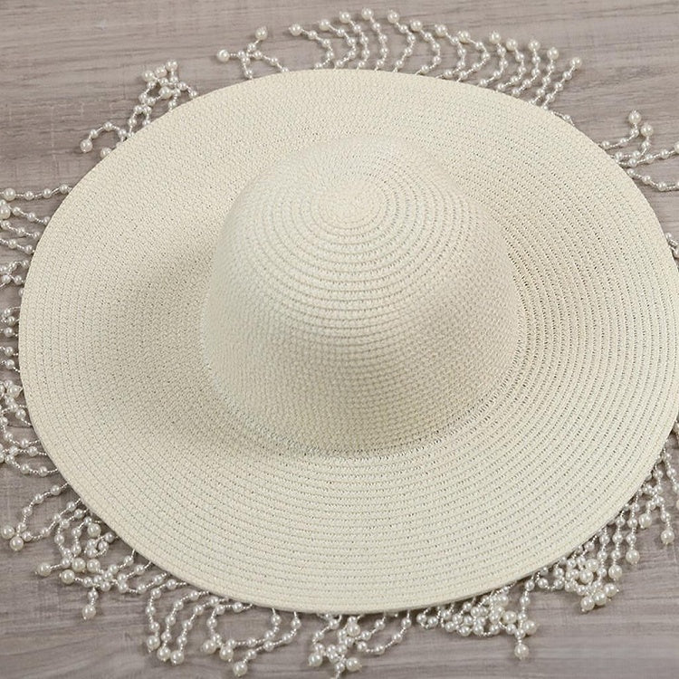Beige Wide-Brim Pearl Straw Hat Vintage Tassel Lolita