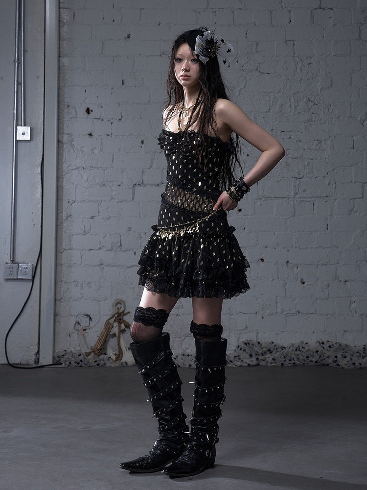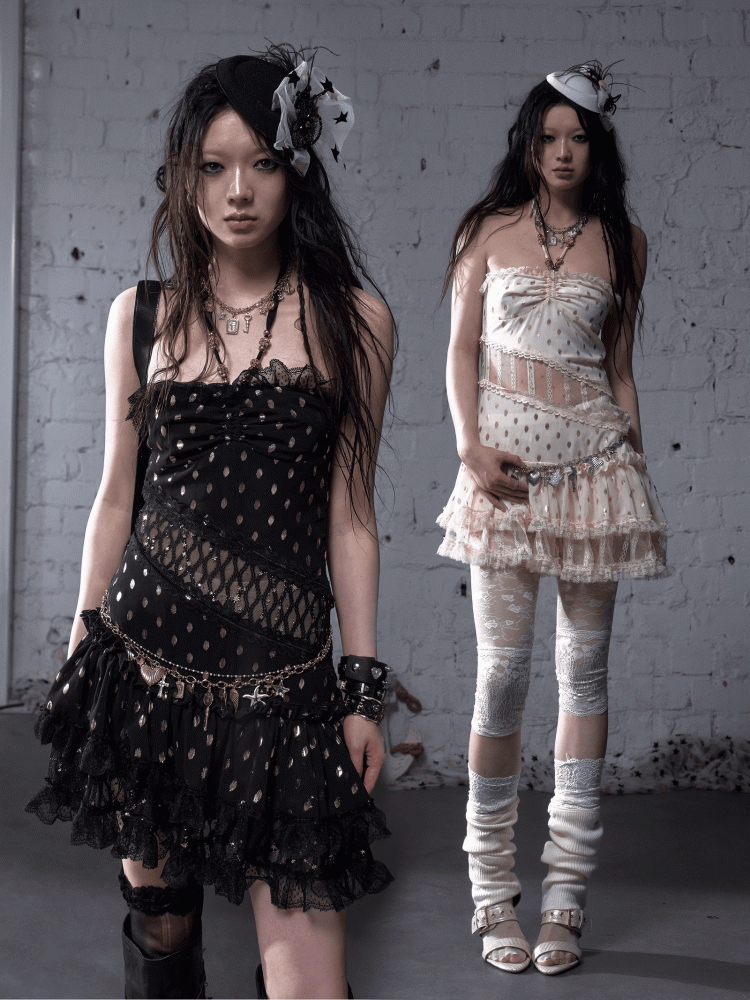 Beige/Black Neck Waist Polka-dot Vintage Halter Lace Patches