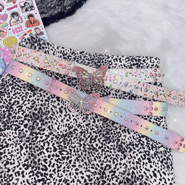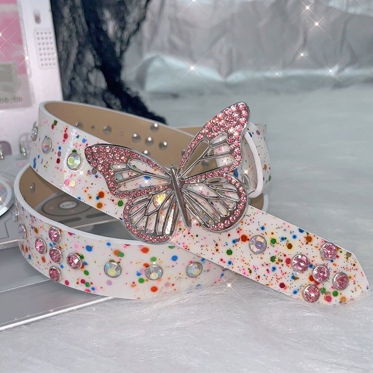 Belt Rhinestone White/Colorful Design Butterfly Decorated Waist