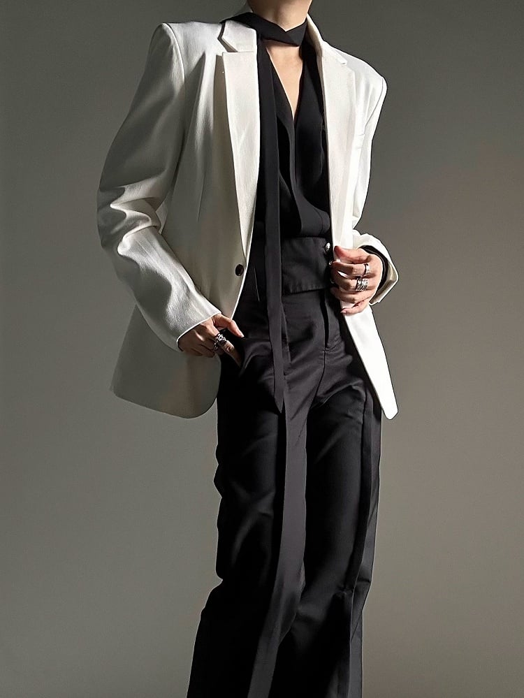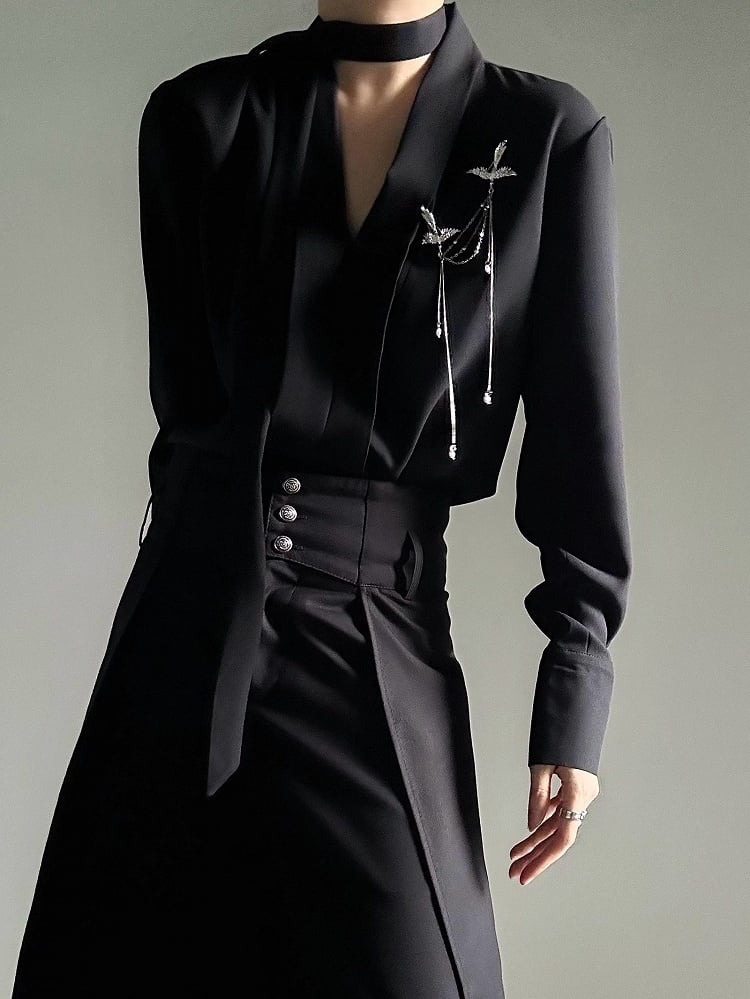 V-Neck Black Blouse in Princely Style with Ribbon Scarf + Bird Brooch
