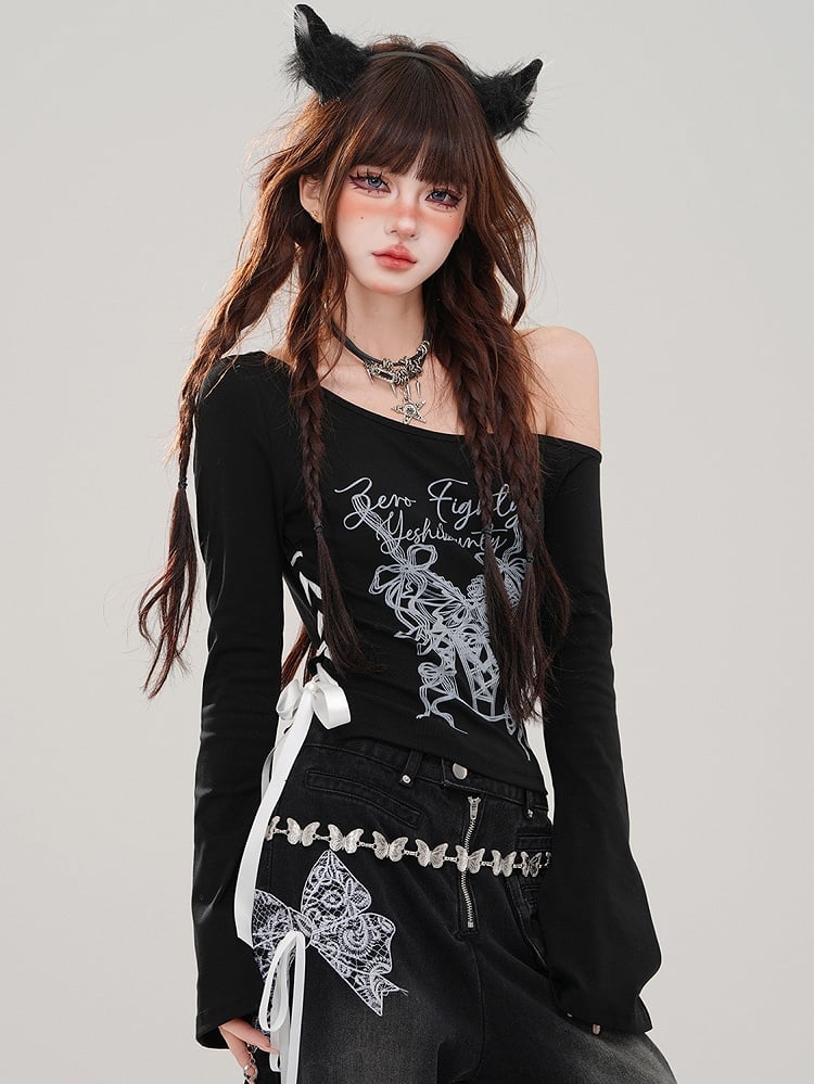 Black Asymmetrical Neckline Graphic Top Lace-up Detail at Waist