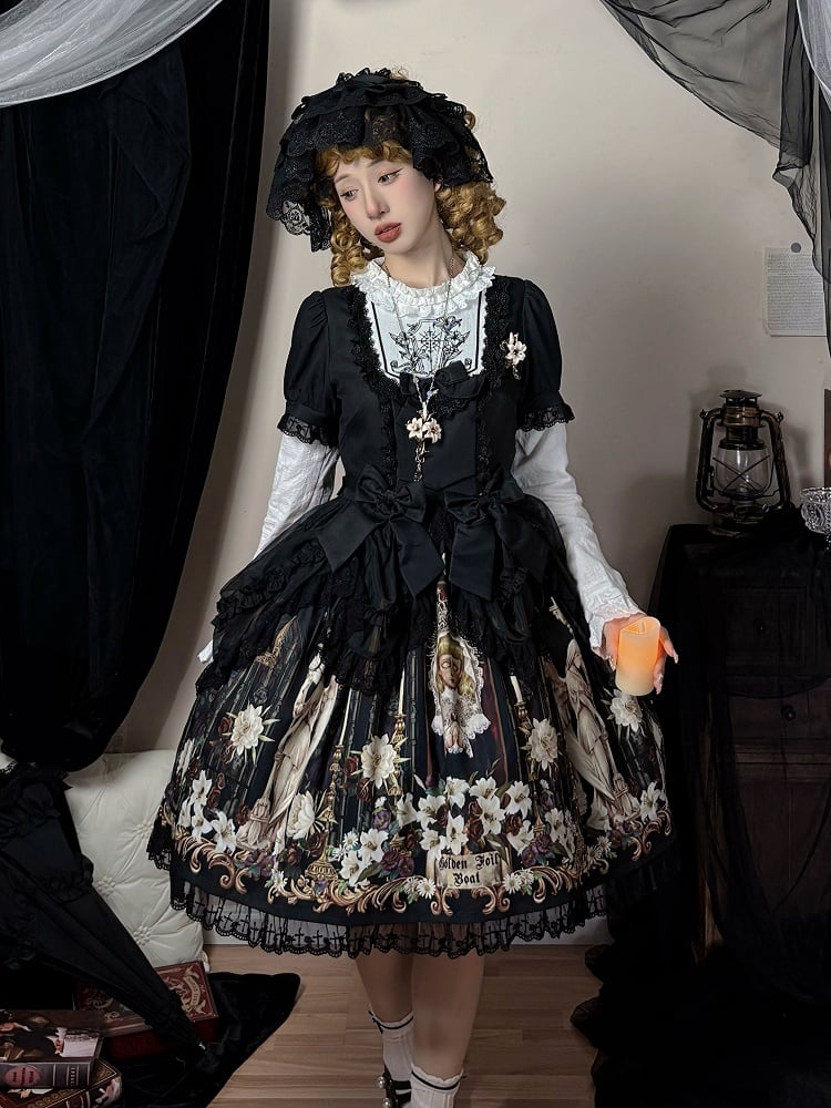 Black and White Old School Lolita Fashion Dress Bowknot Lolita JSK Set