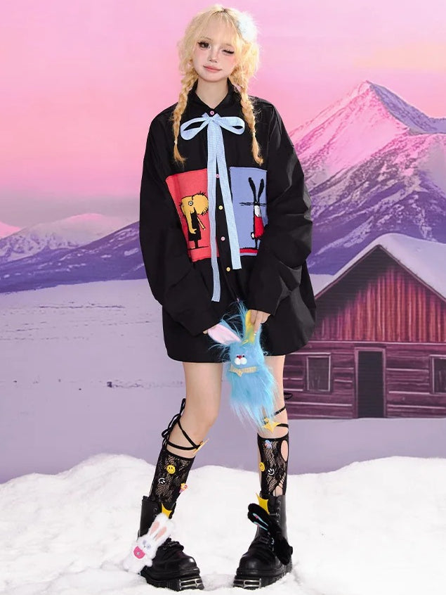 Cute Black Cartoon Animal Appliques Shirt that adds a playful touch to any outfit. Features adorable cartoon animal appliques, perfect for those who love a fun and unique style. Made with high-quality materials for comfort and durability.